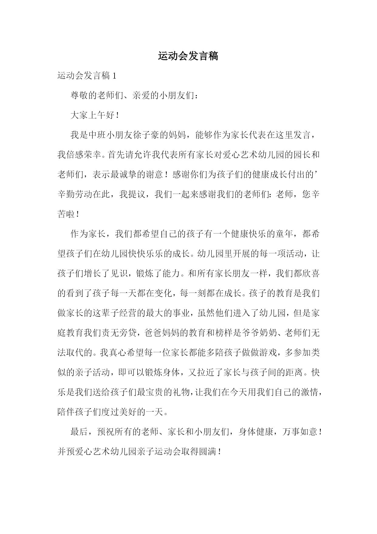 运动会发言稿运动会发言稿1尊敬的老师们、亲爱的小朋友们:大家上午好!我是中班小朋友徐子豪的妈妈,能够作为家长代表在这里发言,我倍感荣幸。首先请允许我代表所有家长对爱心艺术幼儿园的园长和老师们,表示最诚挚的谢意!感谢你们为孩子们的健康成长付出的’辛勤劳动在此,我提议,我们一起来感谢我们的老师们:老师,您辛苦啦!作为家长,我们都希望自己的孩子有一个健康快乐的童年,都希望孩子们在幼儿园快快乐乐的成长。幼儿园里开展的每一项活动,让孩子们增长了见识,锻炼了能力。和所有家长朋友一样,我们都欣喜的看到了孩子每一天都在变