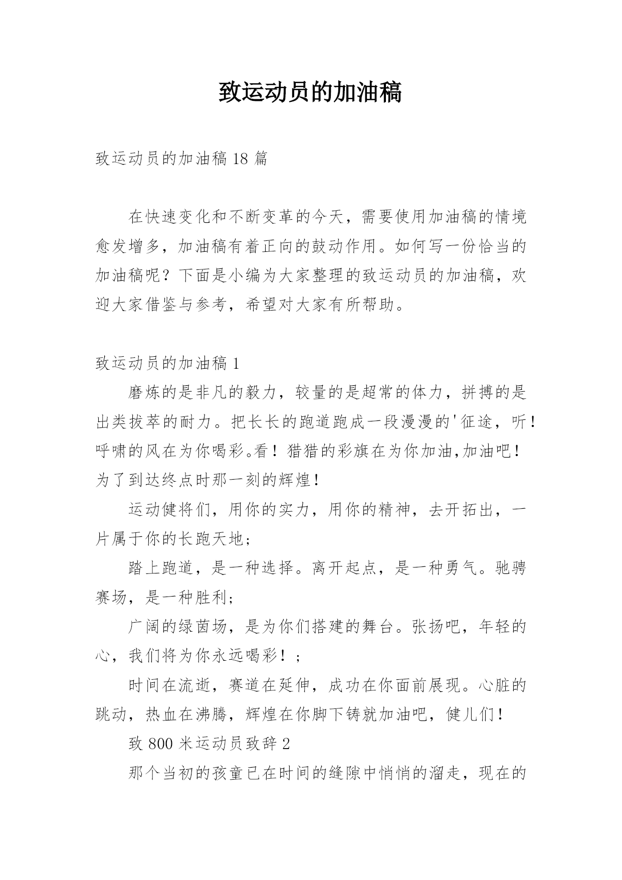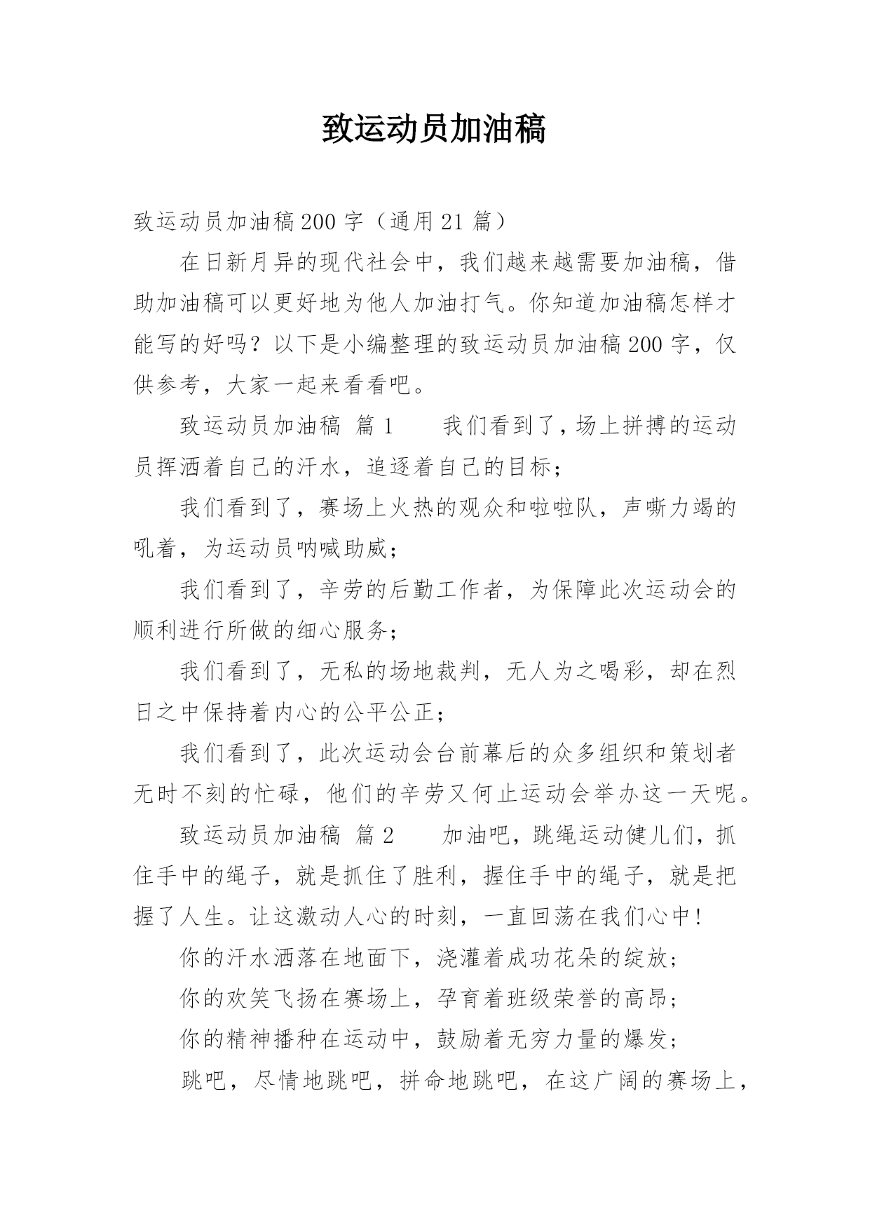 致运动员加油稿致运动员加油稿200字(通用21篇)在日新月异的现代社会中,我们越来越需要加油稿,借助加油稿可以更好地为他人加油打气。你知道加油稿怎样才能写的好吗?以下是小编整理的致运动员加油稿200字,仅供参考,大家一起来看看吧。致运动员加油稿篇1我们看到了,场上拼搏的运动员挥洒着自己的汗水,追逐着自己的目标;我们看到了,赛场上火热的观众和啦啦队,声嘶力竭的吼着,为运动员呐喊助威;我们看到了,辛劳的后勤工作者,为保障此次运动会的顺利进行所做的细心服务;我们看到了,无私的场地裁判,无人为之喝彩,却在烈日之中