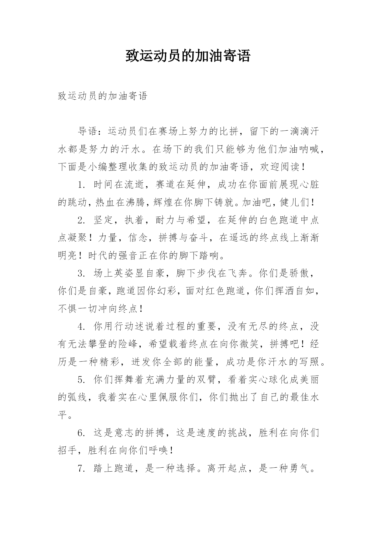 致运动员的加油寄语致运动员的加油寄语导语:运动员们在赛场上努力的比拼,留下的一滴滴汗水都是努力的汗水。在场下的我们只能够为他们加油呐喊,下面是小编整理收集的致运动员的加油寄语,欢迎阅读!1.时间在流逝,赛道在延伸,成功在你面前展现心脏的跳动,热血在沸腾,辉煌在你脚下铸就。加油吧,健儿们!2.坚定,执着,耐力与希望,在延伸的白色跑道中点点凝聚!力量,信念,拼搏与奋斗,在遥远的终点线上渐渐明亮!时代的强音正在你的脚下踏响。3.场上英姿显自豪,脚下步伐在飞奔。你们是骄傲,你们是自豪,跑道因你幻彩,面对红色跑道,