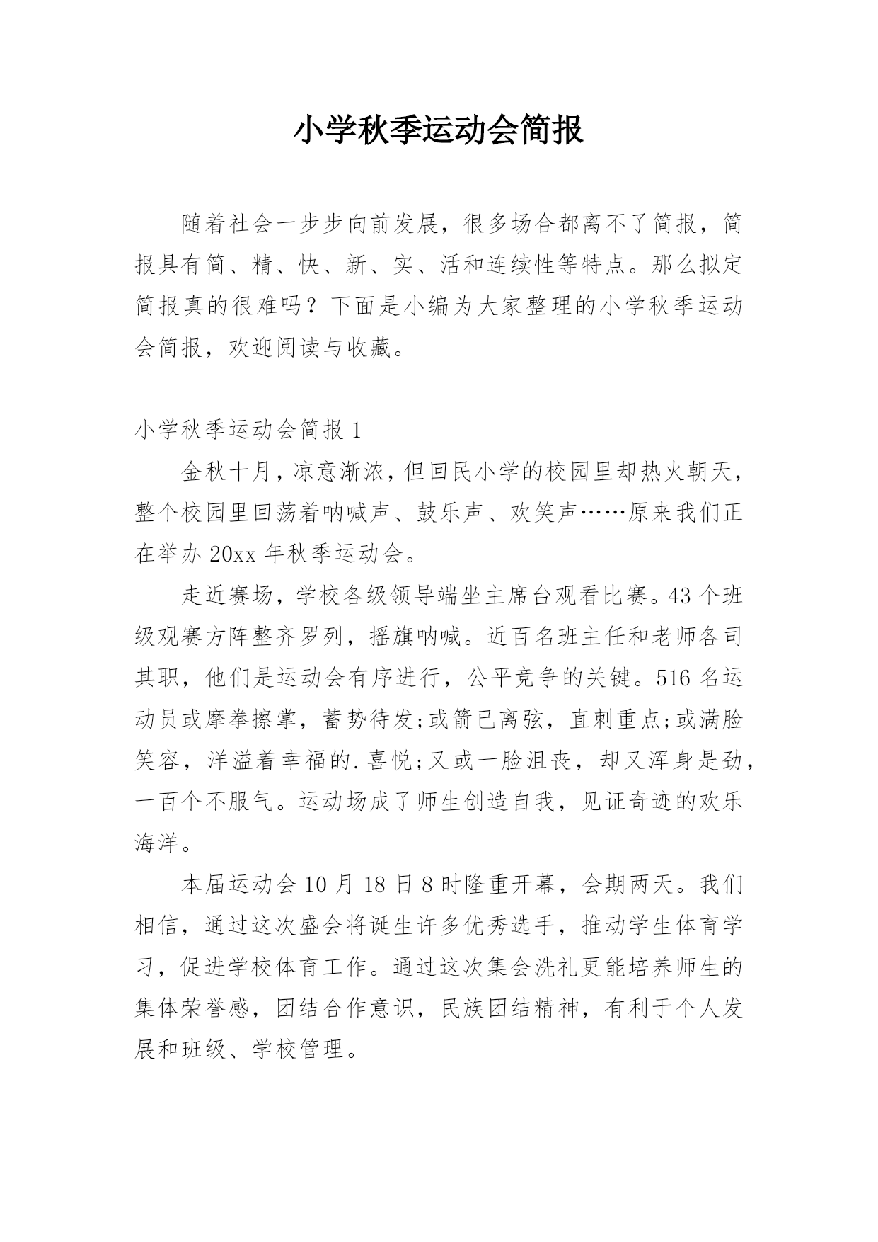 小学秋季运动会简报随着社会一步步向前发展,很多场合都离不了简报,简报具有简、精、快、新、实、活和连续性等特点。那么拟定简报真的很难吗?下面是小编为大家整理的小学秋季运动会简报,欢迎阅读与收藏。小学秋季运动会简报1金秋十月,凉意渐浓,但回民小学的校园里却热火朝天,整个校园里回荡着呐喊声、鼓乐声、欢笑声……原来我们正在举办20xx年秋季运动会。走近赛场,学校各级领导端坐主席台观看比赛。43个班级观赛方阵整齐罗列,摇旗呐喊。近百名班主任和老师各司其职,他们是运动会有序进行,公平竞争的关键。516名运动员或摩拳擦