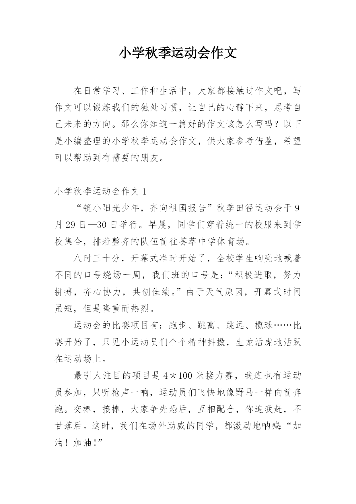 小学秋季运动会作文在日常学习、工作和生活中,大家都接触过作文吧,写作文可以锻炼我们的独处习惯,让自己的心静下来,思考自己未来的方向。那么你知道一篇好的作文该怎么写吗?以下是小编整理的小学秋季运动会作文,供大家参考借鉴,希望可以帮助到有需要的朋友。小学秋季运动会作文1“镜小阳光少年,齐向祖国报告”秋季田径运动会于9月29日—30日举行。早晨,同学们穿着统一的校服来到学校集合,排着整齐的队伍前往荟萃中学体育场。八时三十分,开幕式准时开始了,全校学生响亮地喊着不同的口号绕场一周,我们班的口号是:“积极进取,努力