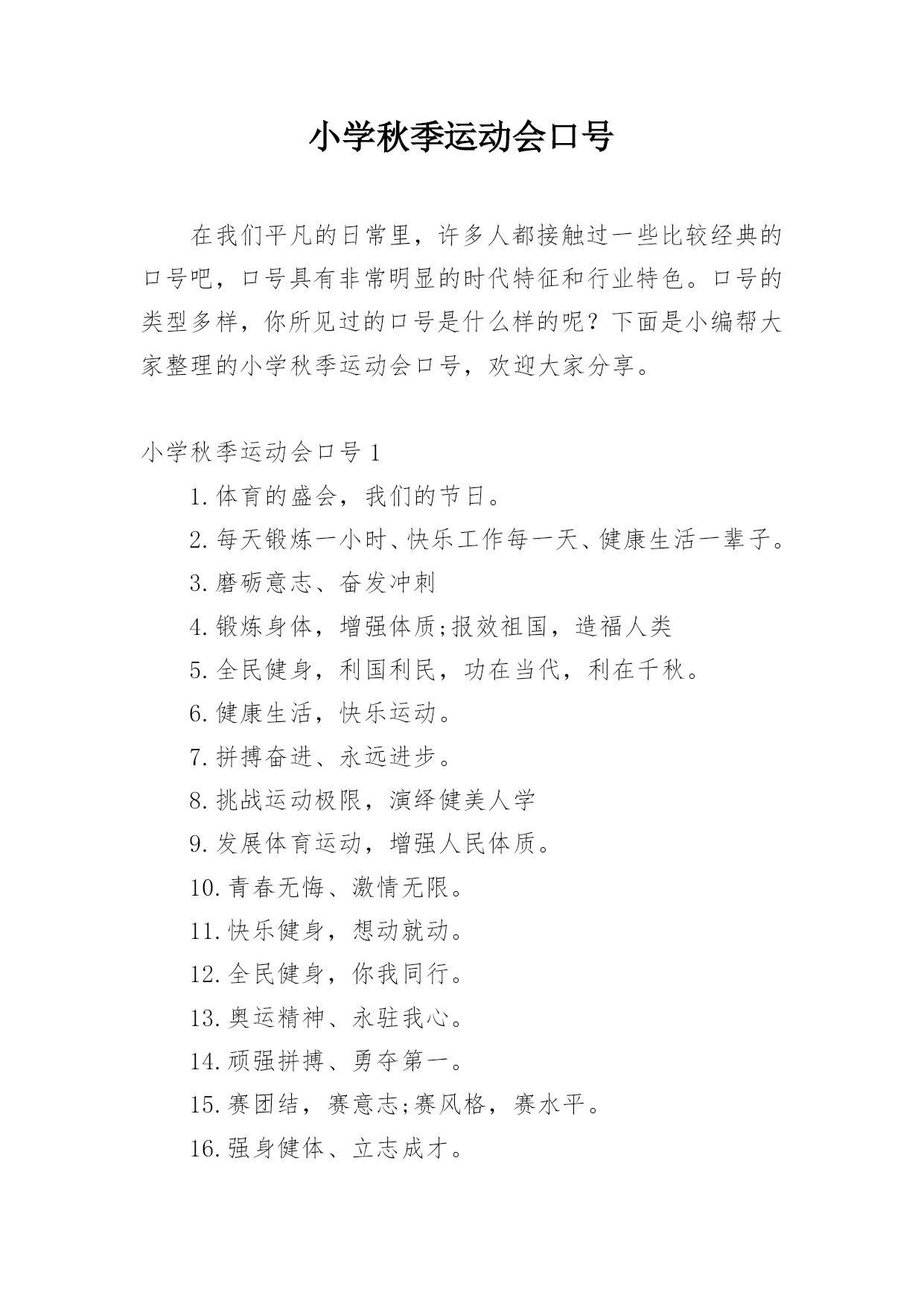 小学秋季运动会口号在我们平凡的日常里,许多人都接触过一些比较经典的口号吧,口号具有非常明显的时代特征和行业特色。口号的类型多样,你所见过的口号是什么样的呢?下面是小编帮大家整理的小学秋季运动会口号,欢迎大家分享。小学秋季运动会口号11.体育的盛会,我们的节日。2.每天锻炼一小时、快乐工作每一天、健康生活一辈子。3.磨砺意志、奋发冲刺4.锻炼身体,增强体质;报效祖国,造福人类5.全民健身,利国利民,功在当代,利在千秋。6.健康生活,快乐运动。7.拼搏奋进、永远进步。8.挑战运动极限,演绎健美人学9.发展体育