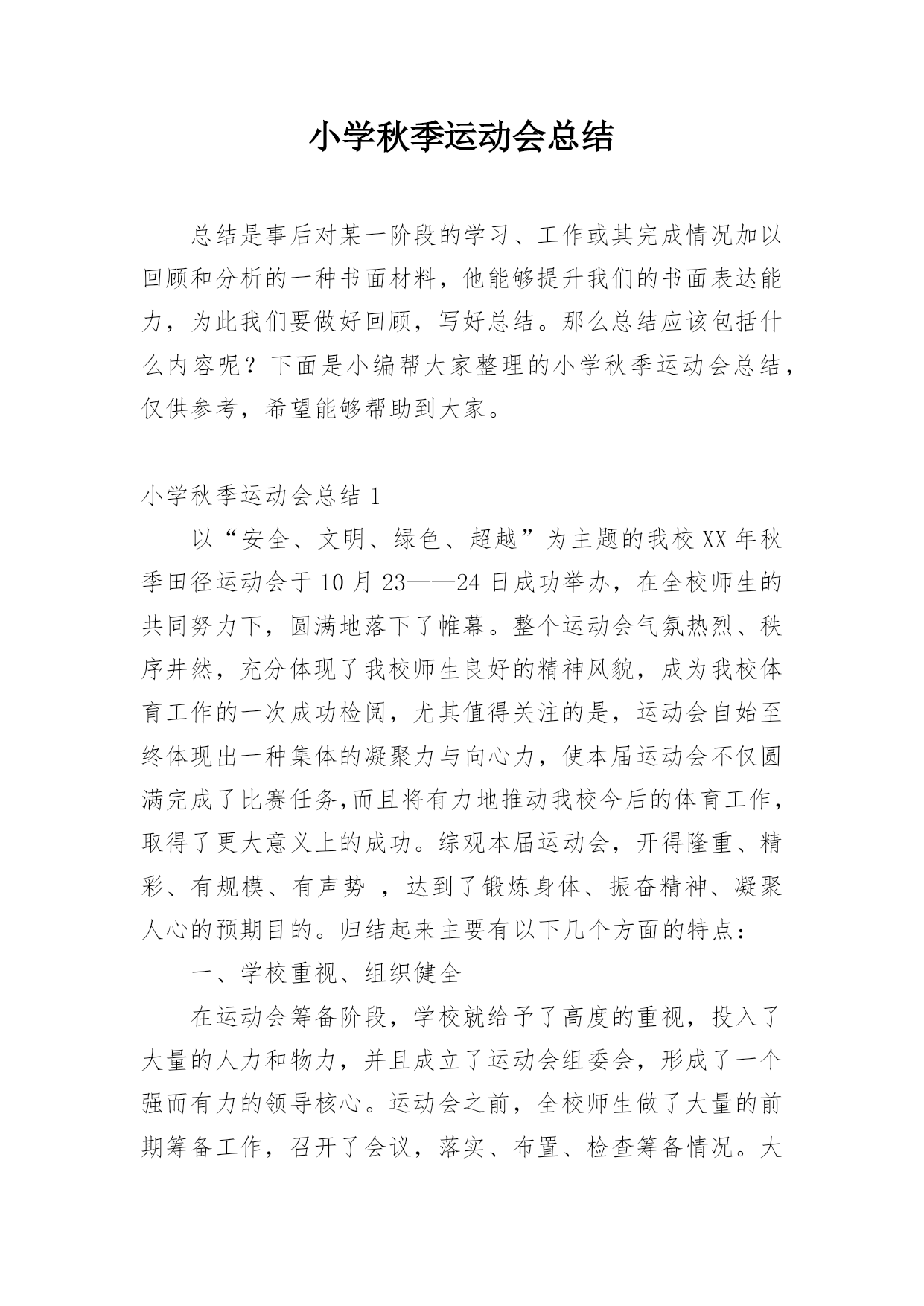小学秋季运动会总结总结是事后对某一阶段的学习、工作或其完成情况加以回顾和分析的一种书面材料,他能够提升我们的书面表达能力,为此我们要做好回顾,写好总结。那么总结应该包括什么内容呢?下面是小编帮大家整理的小学秋季运动会总结,仅供参考,希望能够帮助到大家。小学秋季运动会总结1以“安全、文明、绿色、超越”为主题的我校XX年秋季田径运动会于10月23——24日成功举办,在全校师生的共同努力下,圆满地落下了帷幕。整个运动会气氛热烈、秩序井然,充分体现了我校师生良好的精神风貌,成为我校体育工作的一次成功检阅,尤其值得