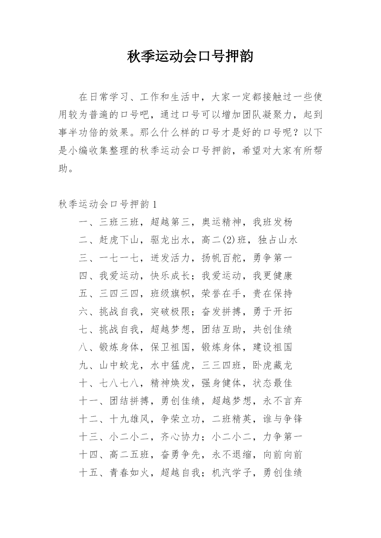 秋季运动会口号押韵在日常学习、工作和生活中,大家一定都接触过一些使用较为普遍的口号吧,通过口号可以增加团队凝聚力,起到事半功倍的效果。那么什么样的口号才是好的口号呢?以下是小编收集整理的秋季运动会口号押韵,希望对大家有所帮助。秋季运动会口号押韵1一、三班三班,超越第三,奥运精神,我班发杨二、赶虎下山,驱龙出水,高二(2)班,独占山水三、一七一七,迸发活力,扬帆百舵,勇争第一四、我爱运动,快乐成长;我爱运动,我更健康五、三四三四,班级旗帜,荣誉在手,贵在保持六、挑战自我,突破极限;奋发拼搏,勇于开拓七、挑战