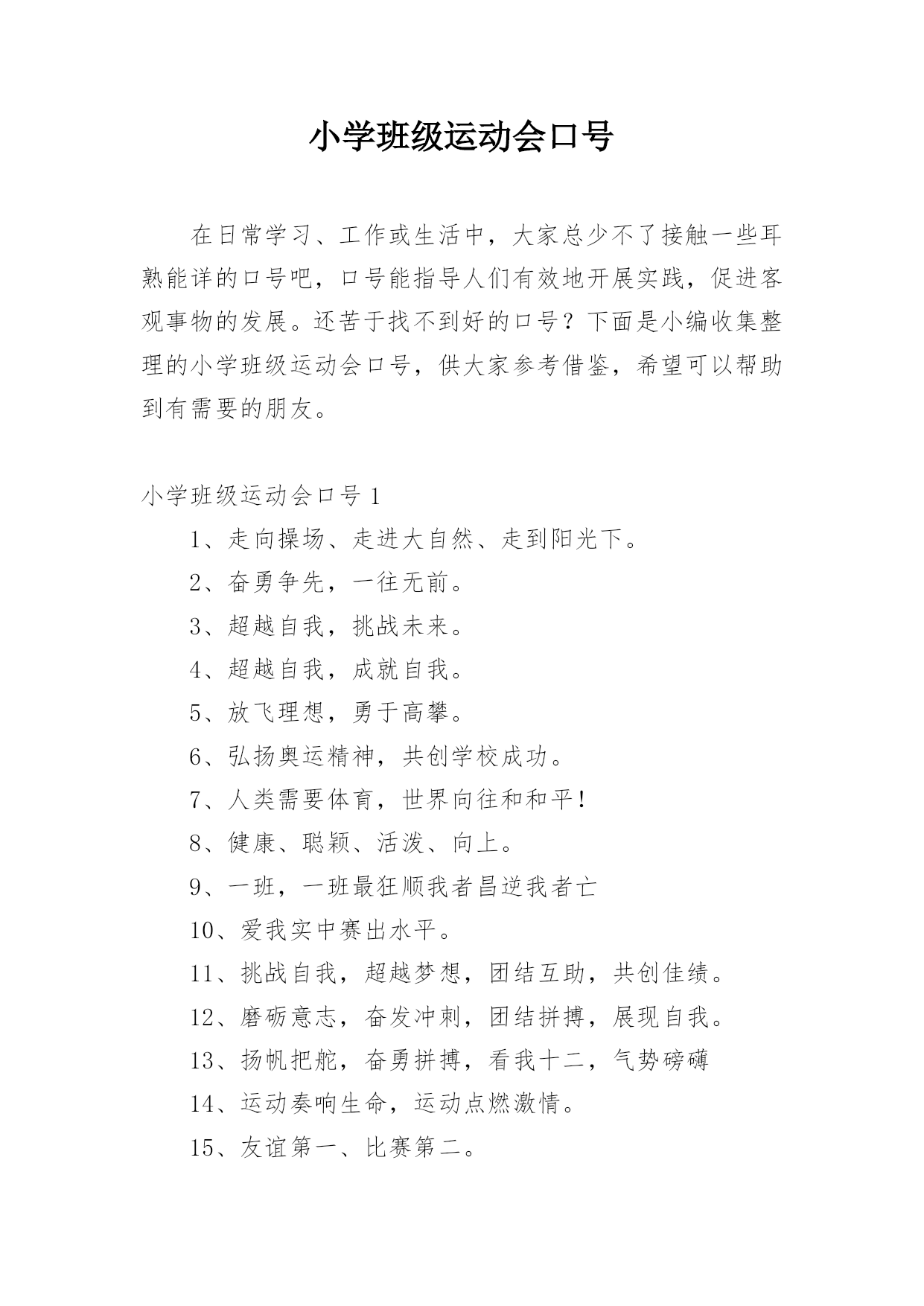 小学班级运动会口号在日常学习、工作或生活中,大家总少不了接触一些耳熟能详的口号吧,口号能指导人们有效地开展实践,促进客观事物的发展。还苦于找不到好的口号?下面是小编收集整理的小学班级运动会口号,供大家参考借鉴,希望可以帮助到有需要的朋友。小学班级运动会口号11、走向操场、走进大自然、走到阳光下。2、奋勇争先,一往无前。3、超越自我,挑战未来。4、超越自我,成就自我。5、放飞理想,勇于高攀。6、弘扬奥运精神,共创学校成功。7、人类需要体育,世界向往和和平!8、健康、聪颖、活泼、向上。9、一班,一班最狂顺我者