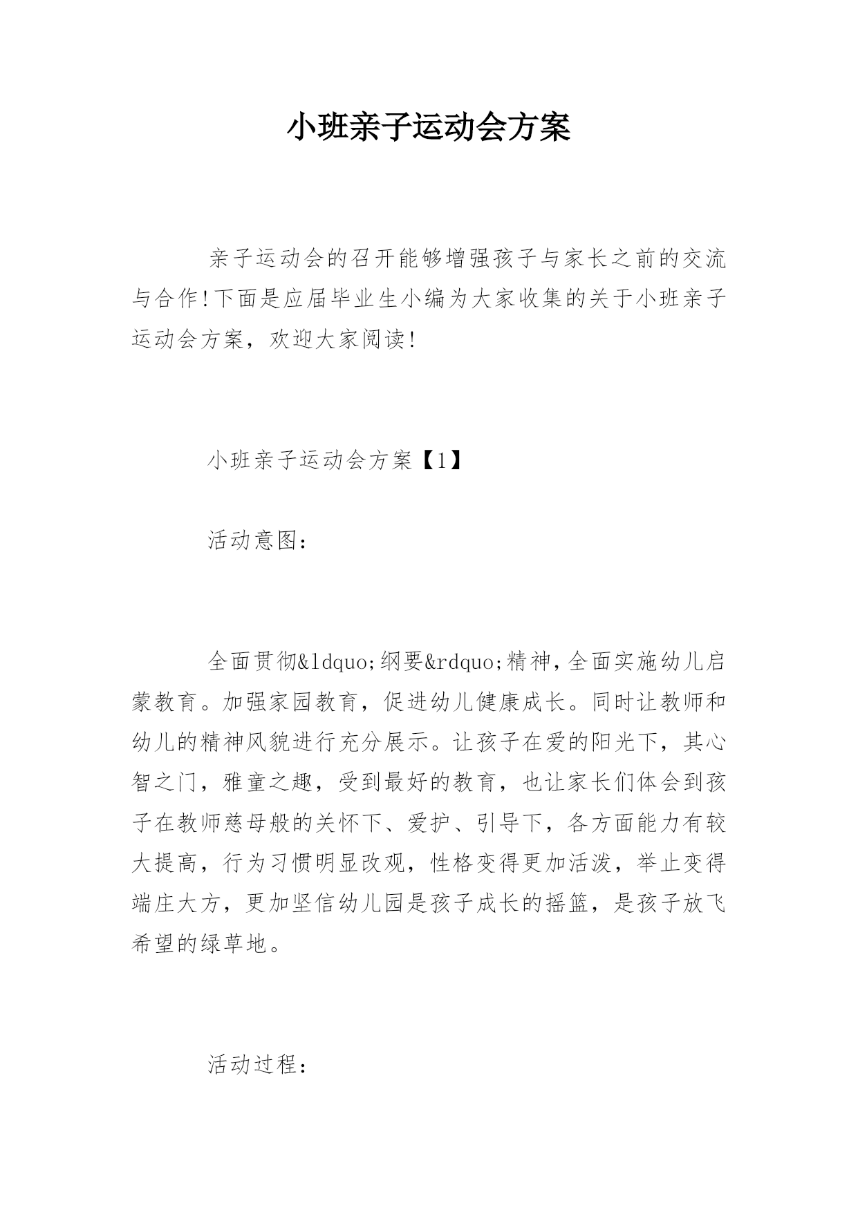 小班亲子运动会方案亲子运动会的召开能够增强孩子与家长之前的交流与合作!下面是应届毕业生小编为大家收集的关于小班亲子运动会方案,欢迎大家阅读!小班亲子运动会方案【1】活动意图:全面贯彻“纲要”精神,全面实施幼儿启蒙教育。加强家园教育,促进幼儿健康成长。同时让教师和幼儿的精神风貌进行充分展示。让孩子在爱的阳光下,其心智之门,雅童之趣,受到最好的教育,也让家长们体会到孩子在教师慈母般的关怀下、爱护、引导下,各方面能力有较大提高,行为习惯明显改观,性格变得更加活泼,举止变得端庄大方,更加坚