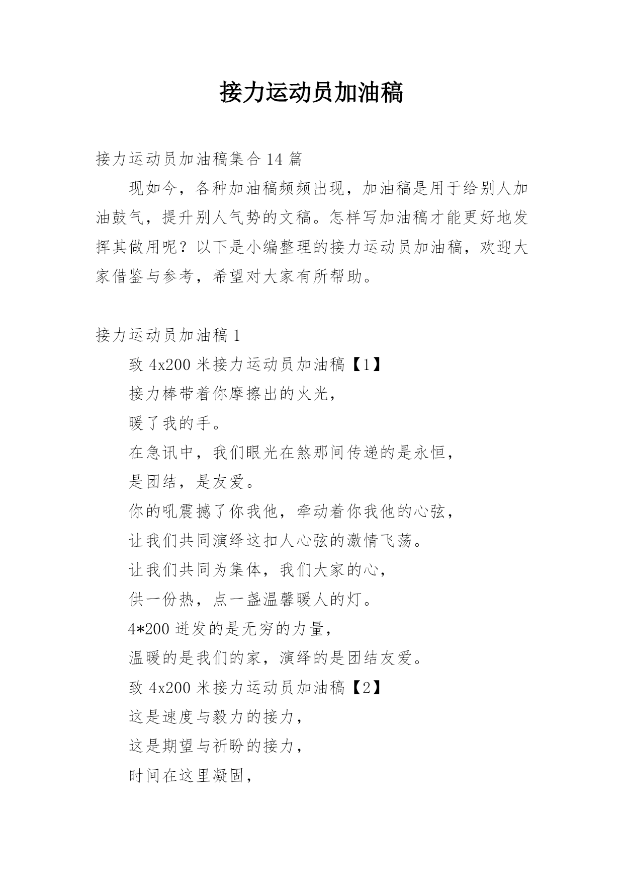 接力运动员加油稿接力运动员加油稿集合14篇现如今,各种加油稿频频出现,加油稿是用于给别人加油鼓气,提升别人气势的文稿。怎样写加油稿才能更好地发挥其做用呢?以下是小编整理的接力运动员加油稿,欢迎大家借鉴与参考,希望对大家有所帮助。接力运动员加油稿1致4x200米接力运动员加油稿【1】接力棒带着你摩擦出的火光,暖了我的手。在急讯中,我们眼光在煞那间传递的是永恒,是团结,是友爱。你的吼震撼了你我他,牵动着你我他的心弦,让我们共同演绎这扣人心弦的激情飞荡。让我们共同为集体,我们大家的心,供一份热,点一盏温馨暖人的