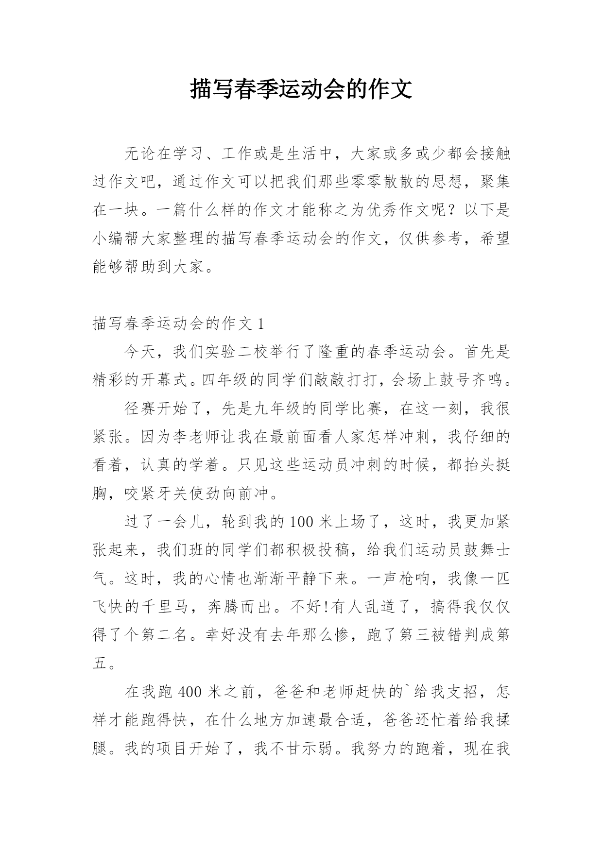 描写春季运动会的作文无论在学习、工作或是生活中,大家或多或少都会接触过作文吧,通过作文可以把我们那些零零散散的思想,聚集在一块。一篇什么样的作文才能称之为优秀作文呢?以下是小编帮大家整理的描写春季运动会的作文,仅供参考,希望能够帮助到大家。描写春季运动会的作文1今天,我们实验二校举行了隆重的春季运动会。首先是精彩的开幕式。四年级的同学们敲敲打打,会场上鼓号齐鸣。径赛开始了,先是九年级的同学比赛,在这一刻,我很紧张。因为李老师让我在最前面看人家怎样冲刺,我仔细的看着,认真的学着。只见这些运动员冲刺的时候,都