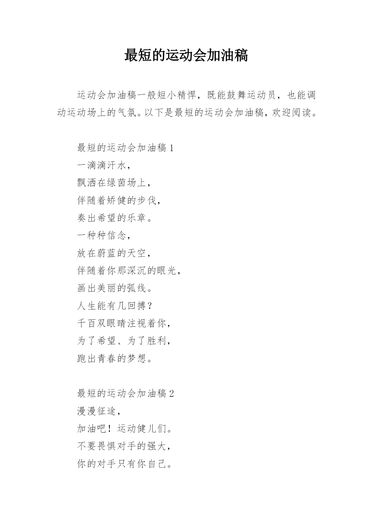 最短的运动会加油稿运动会加油稿一般短小精悍,既能鼓舞运动员,也能调动运动场上的气氛。以下是最短的运动会加油稿,欢迎阅读。最短的运动会加油稿1一滴滴汗水,飘洒在绿茵场上,伴随着矫健的步伐,奏出希望的乐章。一种种信念,放在蔚蓝的天空,伴随着你那深沉的眼光,画出美丽的弧线。人生能有几回搏?千百双眼睛注视着你,为了希望、为了胜利,跑出青春的梦想。最短的运动会加油稿2漫漫征途,加油吧!运动健儿们。不要畏惧对手的强大,你的对手只有你自己。1000米算不得什么,付出的泪水就要得到回报。看,秋风在为你喝彩,和煦的阳光在为