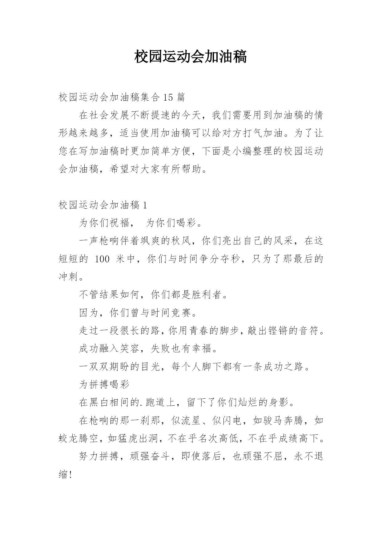 校园运动会加油稿校园运动会加油稿集合15篇在社会发展不断提速的今天,我们需要用到加油稿的情形越来越多,适当使用加油稿可以给对方打气加油。为了让您在写加油稿时更加简单方便,下面是小编整理的校园运动会加油稿,希望对大家有所帮助。校园运动会加油稿1为你们祝福,为你们喝彩。一声枪响伴着飒爽的秋风,你们亮出自己的风采,在这短短的100米中,你们与时间争分夺秒,只为了那最后的冲刺。不管结果如何,你们都是胜利者。因为,你们曾与时间竞赛。走过一段很长的路,你用青春的脚步,敲出铿锵的音符。成功融入笑容,失败也有幸福。一双双
