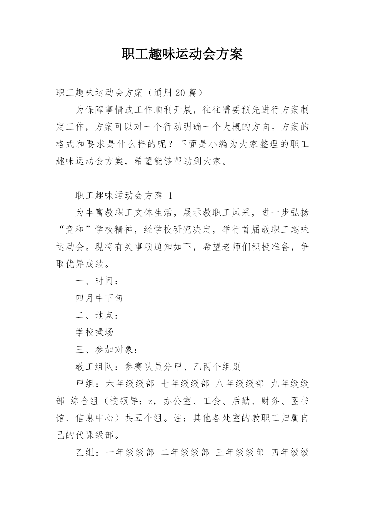 职工趣味运动会方案职工趣味运动会方案(通用20篇)为保障事情或工作顺利开展,往往需要预先进行方案制定工作,方案可以对一个行动明确一个大概的方向。方案的格式和要求是什么样的呢?下面是小编为大家整理的职工趣味运动会方案,希望能够帮助到大家。职工趣味运动会方案1为丰富教职工文体生活,展示教职工风采,进一步弘扬“竞和”学校精神,经学校研究决定,举行首届教职工趣味运动会。现将有关事项通知如下,希望老师们积极准备,争取优异成绩。一、时间:四月中下旬二、地点:学校操场三、参加对象:教工组队:参赛队员分甲、乙两个组别甲组