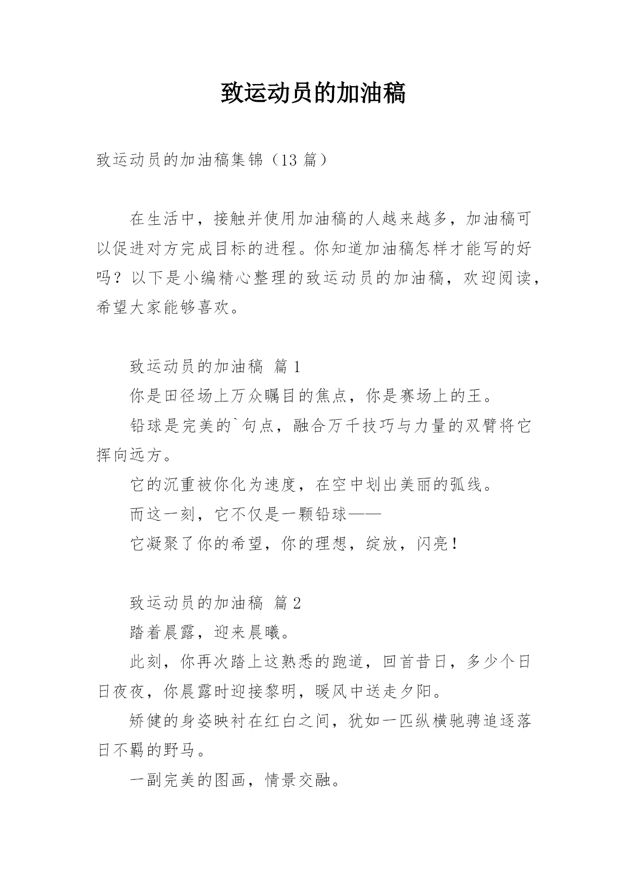 致运动员的加油稿致运动员的加油稿集锦(13篇)在生活中,接触并使用加油稿的人越来越多,加油稿可以促进对方完成目标的进程。你知道加油稿怎样才能写的好吗?以下是小编精心整理的致运动员的加油稿,欢迎阅读,希望大家能够喜欢。致运动员的加油稿篇1你是田径场上万众瞩目的焦点,你是赛场上的王。铅球是完美的`句点,融合万千技巧与力量的双臂将它挥向远方。它的沉重被你化为速度,在空中划出美丽的弧线。而这一刻,它不仅是一颗铅球——它凝聚了你的希望,你的理想,绽放,闪亮!致运动员的加油稿篇2踏着晨露,迎来晨曦。此刻,你再次踏上这