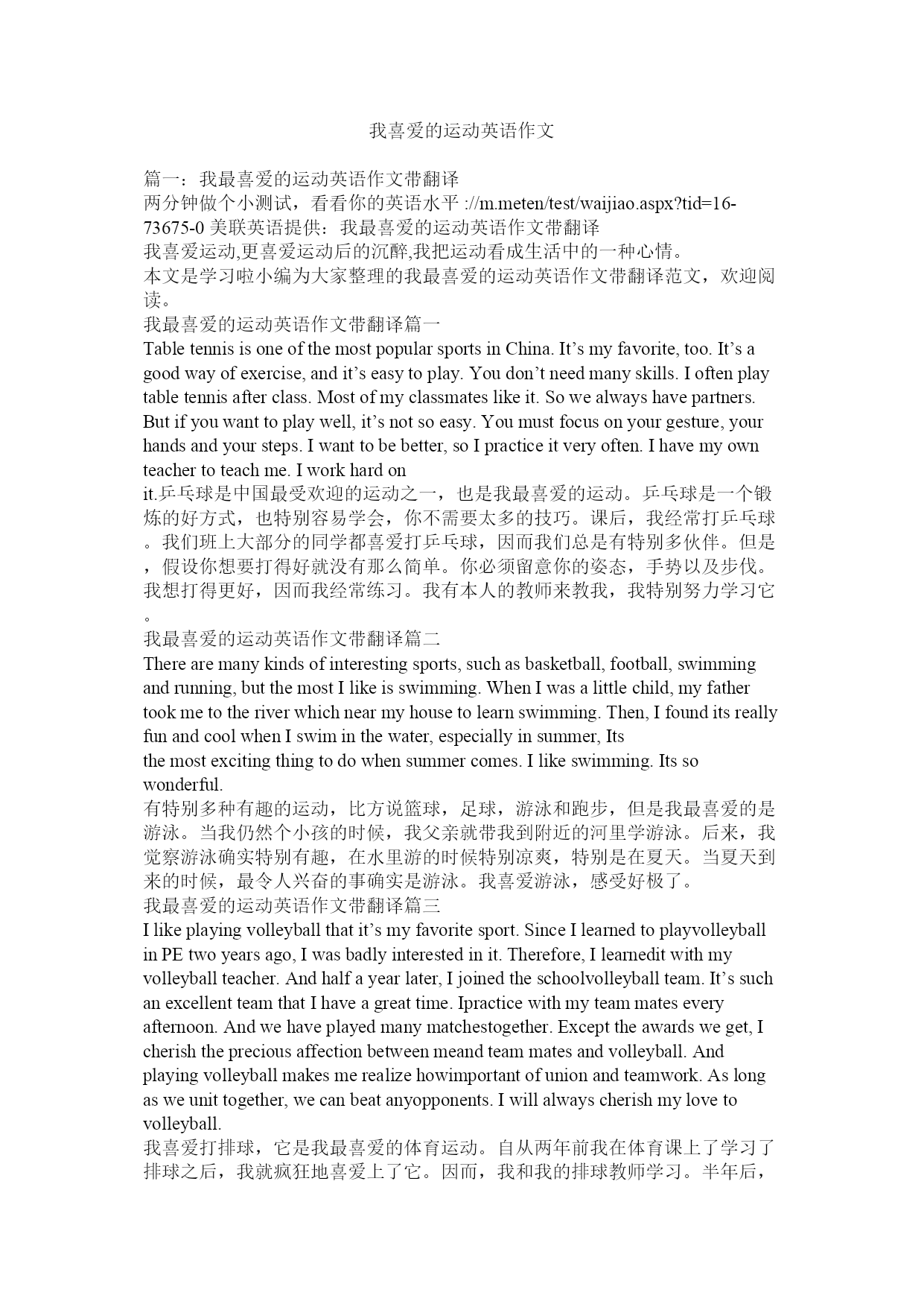 我喜爱的运动英语作文篇一:我最喜爱的运动英语作文带翻译两分钟做个小测试,看看你的英语水平://m.meten/test/waijiao.aspx?tid=16-73675-0美联英语提供:我最喜爱的运动英语作文带翻译我喜爱运动,更喜爱运动后的沉醉,我把运动看成生活中的一种心情。本文是学习啦小编为大家整理的我最喜爱的运动英语作文带翻译范文,欢迎阅读。我最喜爱的运动英语作文带翻译篇一TabletennisisoneofthemostpopularsportsinChina.It’smyfavorite,too