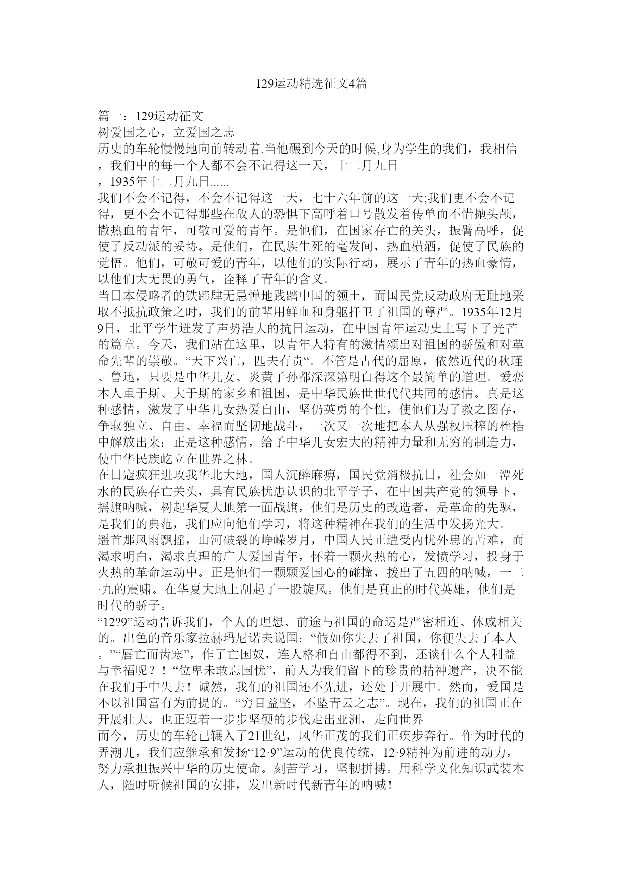 129运动精选征文4篇篇一:129运动征文树爱国之心,立爱国之志历史的车轮慢慢地向前转动着.当他碾到今天的时候,身为学生的我们,我相信,我们中的每一个人都不会不记得这一天,十二月九日,1935年十二月九日......我们不会不记得,不会不记得这一天,七十六年前的这一天;我们更不会不记得,更不会不记得那些在敌人的恐惧下高呼着口号散发着传单而不惜抛头颅,撒热血的青年,可敬可爱的青年。是他们,在国家存亡的关头,振臂高呼,促使了反动派的妥协。是他们,在民族生死的毫发间,热血横洒,促使了民族的觉悟。他们,可敬可爱的