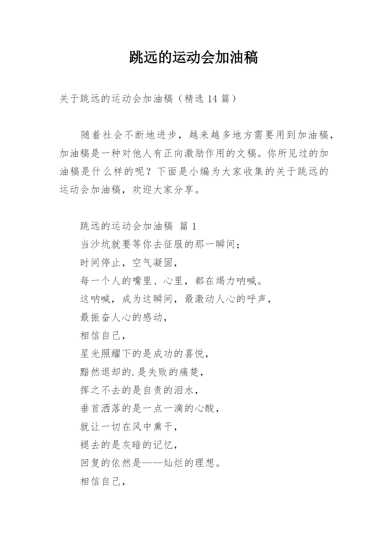 跳远的运动会加油稿关于跳远的运动会加油稿(精选14篇)随着社会不断地进步,越来越多地方需要用到加油稿,加油稿是一种对他人有正向激励作用的文稿。你所见过的加油稿是什么样的呢?下面是小编为大家收集的关于跳远的运动会加油稿,欢迎大家分享。跳远的运动会加油稿篇1当沙坑就要等你去征服的那一瞬间;时间停止,空气凝固,每一个人的嘴里、心里,都在竭力呐喊。这呐喊,成为这瞬间,最激动人心的呼声,最振奋人心的感动,相信自己,星光照耀下的是成功的喜悦,黯然退却的.是失败的痛楚,挥之不去的是自责的泪水,垂首洒落的是一点一滴的心酸