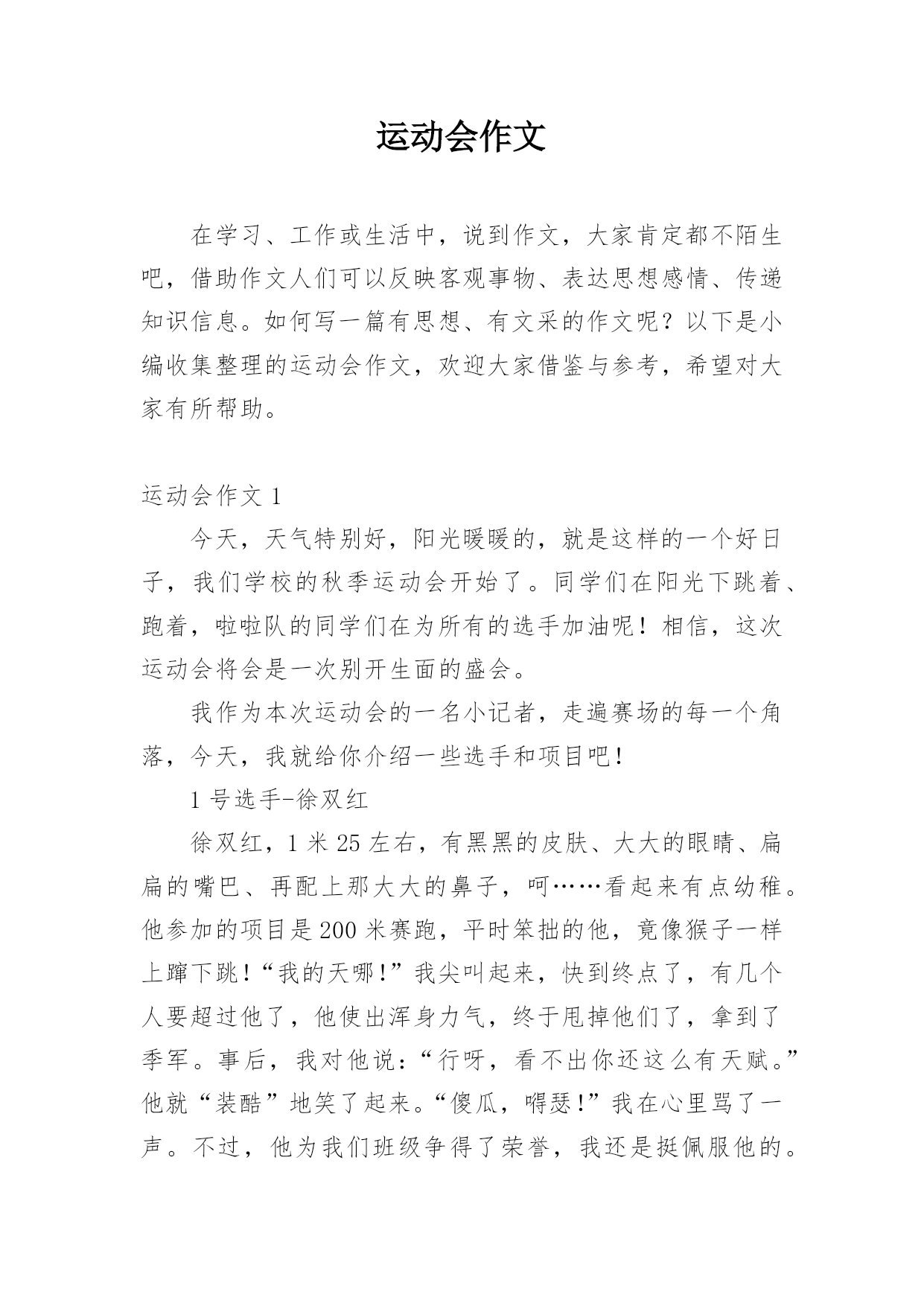 运动会作文在学习、工作或生活中,说到作文,大家肯定都不陌生吧,借助作文人们可以反映客观事物、表达思想感情、传递知识信息。如何写一篇有思想、有文采的作文呢?以下是小编收集整理的运动会作文,欢迎大家借鉴与参考,希望对大家有所帮助。运动会作文1今天,天气特别好,阳光暖暖的,就是这样的一个好日子,我们学校的秋季运动会开始了。同学们在阳光下跳着、跑着,啦啦队的同学们在为所有的选手加油呢!相信,这次运动会将会是一次别开生面的盛会。我作为本次运动会的一名小记者,走遍赛场的每一个角落,今天,我就给你介绍一些选手和项目吧!