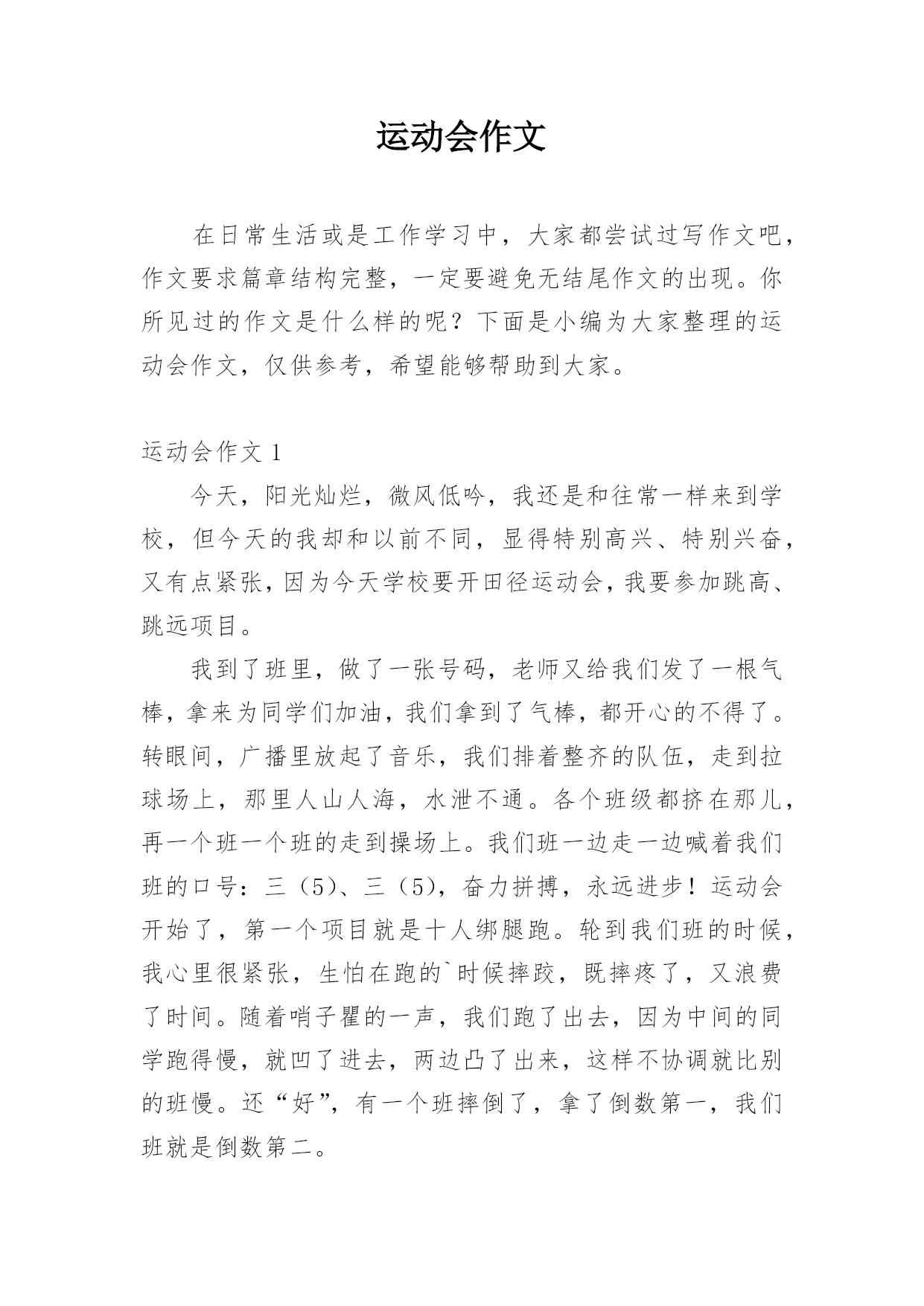 运动会作文在日常生活或是工作学习中,大家都尝试过写作文吧,作文要求篇章结构完整,一定要避免无结尾作文的出现。你所见过的作文是什么样的呢?下面是小编为大家整理的运动会作文,仅供参考,希望能够帮助到大家。运动会作文1今天,阳光灿烂,微风低吟,我还是和往常一样来到学校,但今天的我却和以前不同,显得特别高兴、特别兴奋,又有点紧张,因为今天学校要开田径运动会,我要参加跳高、跳远项目。我到了班里,做了一张号码,老师又给我们发了一根气棒,拿来为同学们加油,我们拿到了气棒,都开心的不得了。转眼间,广播里放起了音乐,我们排