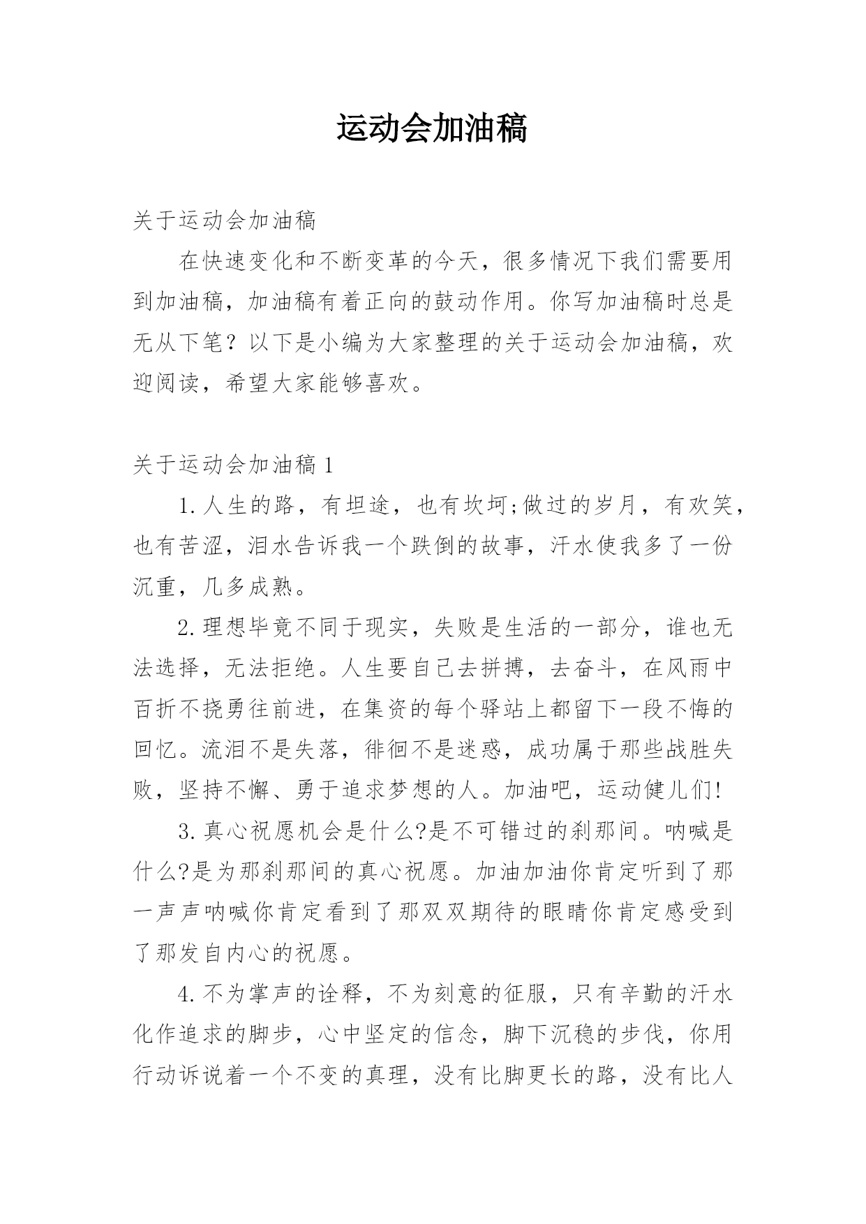 运动会加油稿关于运动会加油稿在快速变化和不断变革的今天,很多情况下我们需要用到加油稿,加油稿有着正向的鼓动作用。你写加油稿时总是无从下笔?以下是小编为大家整理的关于运动会加油稿,欢迎阅读,希望大家能够喜欢。关于运动会加油稿11.人生的路,有坦途,也有坎坷;做过的岁月,有欢笑,也有苦涩,泪水告诉我一个跌倒的故事,汗水使我多了一份沉重,几多成熟。2.理想毕竟不同于现实,失败是生活的一部分,谁也无法选择,无法拒绝。人生要自己去拼搏,去奋斗,在风雨中百折不挠勇往前进,在集资的每个驿站上都留下一段不悔的回忆。流泪不
