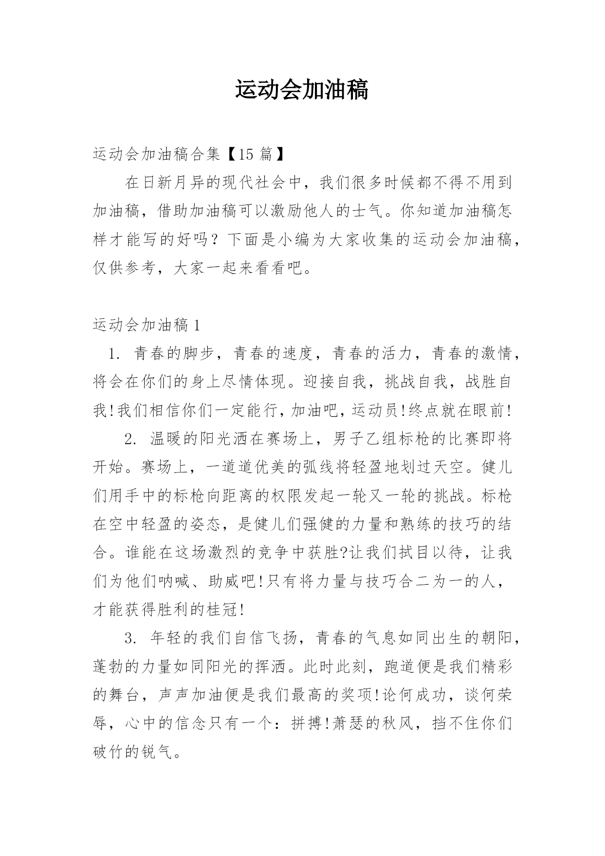 运动会加油稿运动会加油稿合集【15篇】在日新月异的现代社会中,我们很多时候都不得不用到加油稿,借助加油稿可以激励他人的士气。你知道加油稿怎样才能写的好吗?下面是小编为大家收集的运动会加油稿,仅供参考,大家一起来看看吧。运动会加油稿11.青春的脚步,青春的速度,青春的活力,青春的激情,将会在你们的身上尽情体现。迎接自我,挑战自我,战胜自我!我们相信你们一定能行,加油吧,运动员!终点就在眼前!2.温暖的阳光洒在赛场上,男子乙组标枪的比赛即将开始。赛场上,一道道优美的弧线将轻盈地划过天空。健儿们用手中的标枪向距