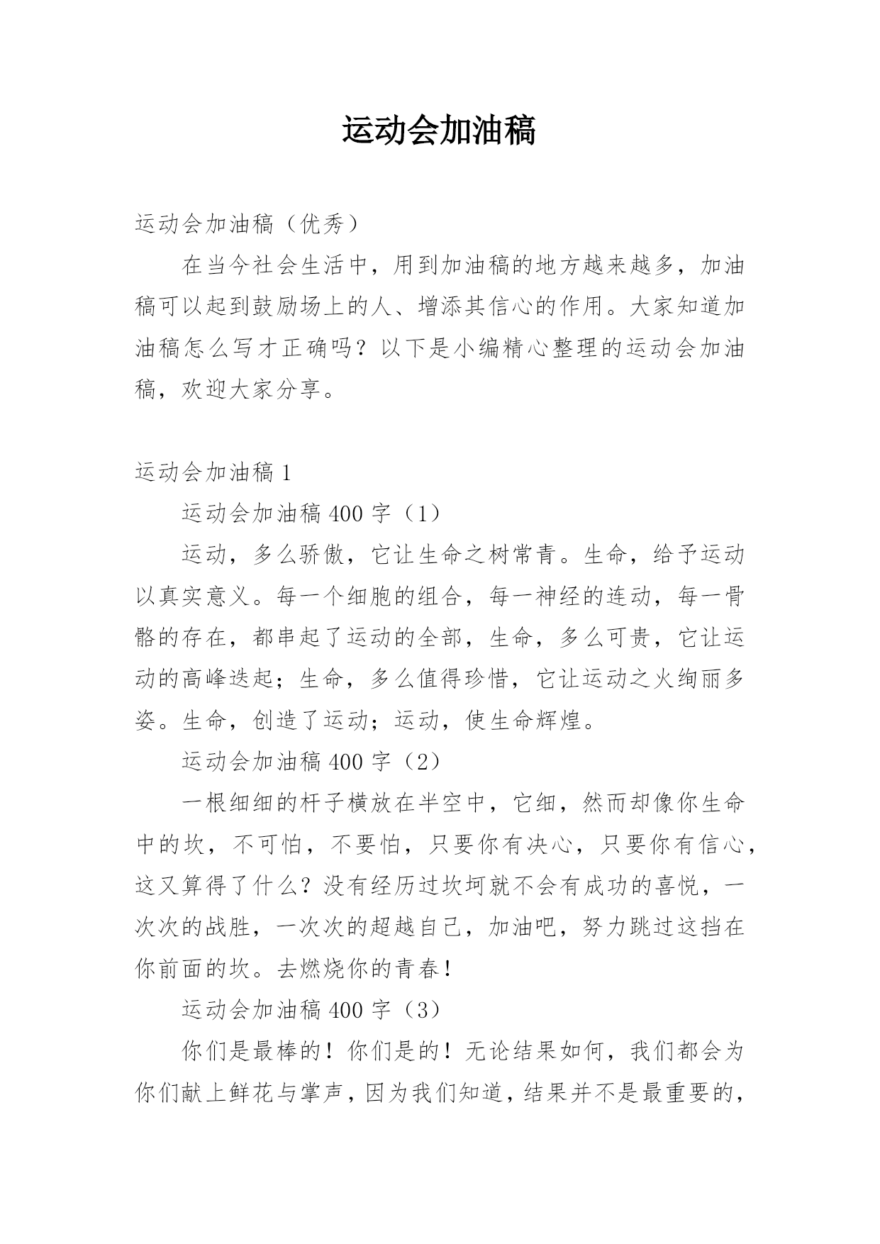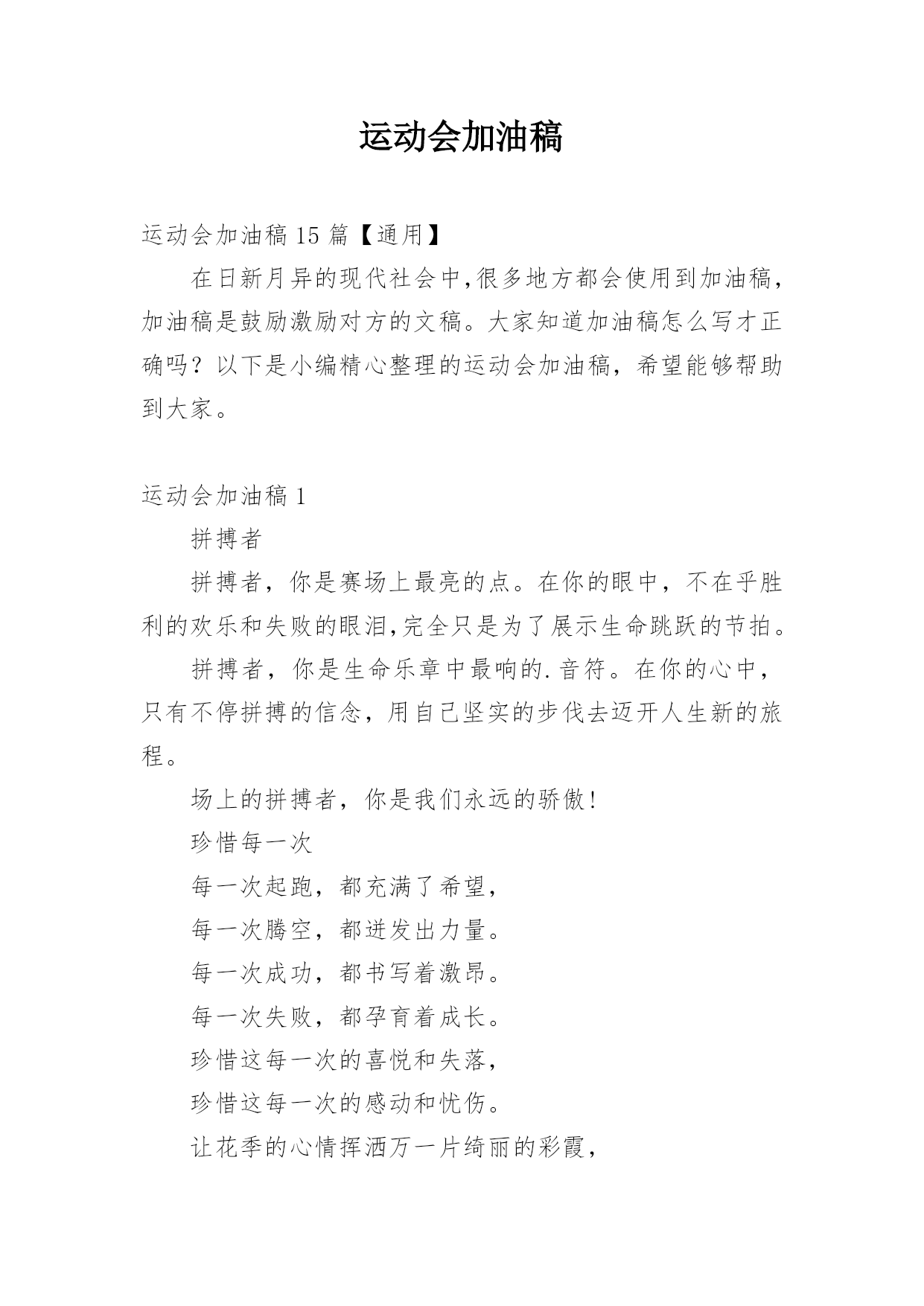 运动会加油稿运动会加油稿15篇【通用】在日新月异的现代社会中,很多地方都会使用到加油稿,加油稿是鼓励激励对方的文稿。大家知道加油稿怎么写才正确吗?以下是小编精心整理的运动会加油稿,希望能够帮助到大家。运动会加油稿1拼搏者拼搏者,你是赛场上最亮的点。在你的眼中,不在乎胜利的欢乐和失败的眼泪,完全只是为了展示生命跳跃的节拍。拼搏者,你是生命乐章中最响的.音符。在你的心中,只有不停拼搏的信念,用自己坚实的步伐去迈开人生新的旅程。场上的拼搏者,你是我们永远的骄傲!珍惜每一次每一次起跑,都充满了希望,每一次腾空,都