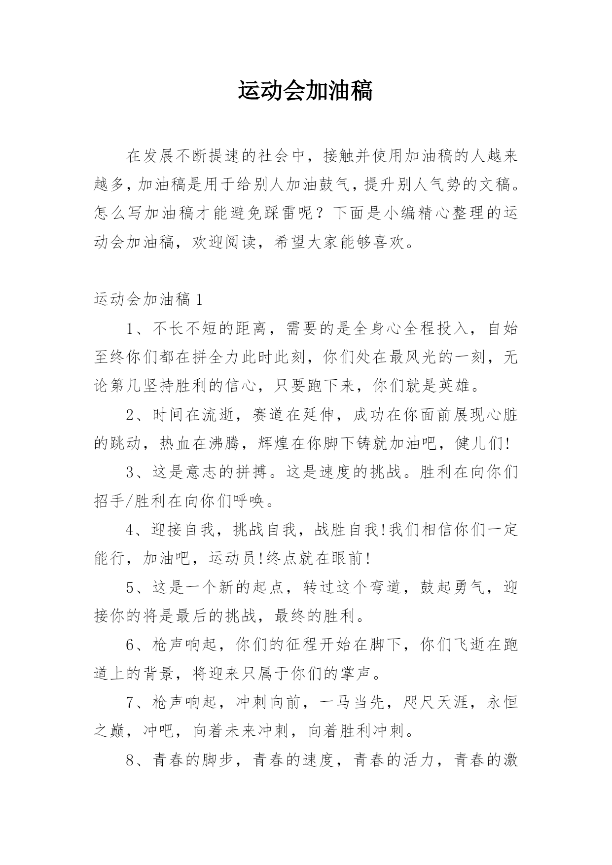运动会加油稿在发展不断提速的社会中,接触并使用加油稿的人越来越多,加油稿是用于给别人加油鼓气,提升别人气势的文稿。怎么写加油稿才能避免踩雷呢?下面是小编精心整理的运动会加油稿,欢迎阅读,希望大家能够喜欢。运动会加油稿11、不长不短的距离,需要的是全身心全程投入,自始至终你们都在拼全力此时此刻,你们处在最风光的一刻,无论第几坚持胜利的信心,只要跑下来,你们就是英雄。2、时间在流逝,赛道在延伸,成功在你面前展现心脏的跳动,热血在沸腾,辉煌在你脚下铸就加油吧,健儿们!3、这是意志的拼搏。这是速度的挑战。胜利在向
