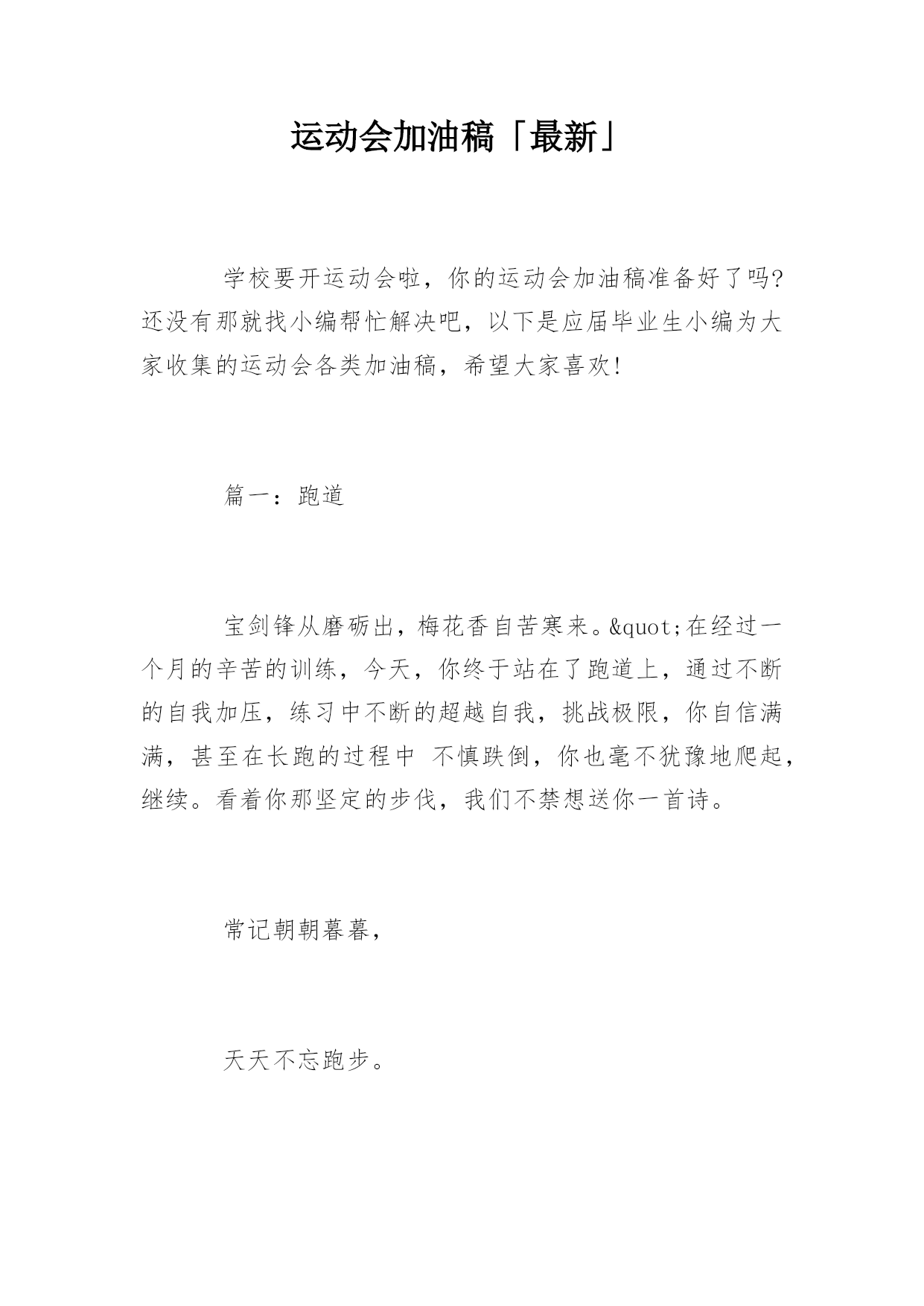 运动会加油稿「最新」学校要开运动会啦,你的运动会加油稿准备好了吗?还没有那就找小编帮忙解决吧,以下是应届毕业生小编为大家收集的运动会各类加油稿,希望大家喜欢!篇一:跑道宝剑锋从磨砺出,梅花香自苦寒来。"在经过一个月的辛苦的训练,今天,你终于站在了跑道上,通过不断的自我加压,练习中不断的超越自我,挑战极限,你自信满满,甚至在长跑的过程中不慎跌倒,你也毫不犹豫地爬起,继续。看着你那坚定的步伐,我们不禁想送你一首诗。常记朝朝暮暮,天天不忘跑步。苦练为参赛,长征一里路,加速,加速!昂首挺胸阔步。努力吧,