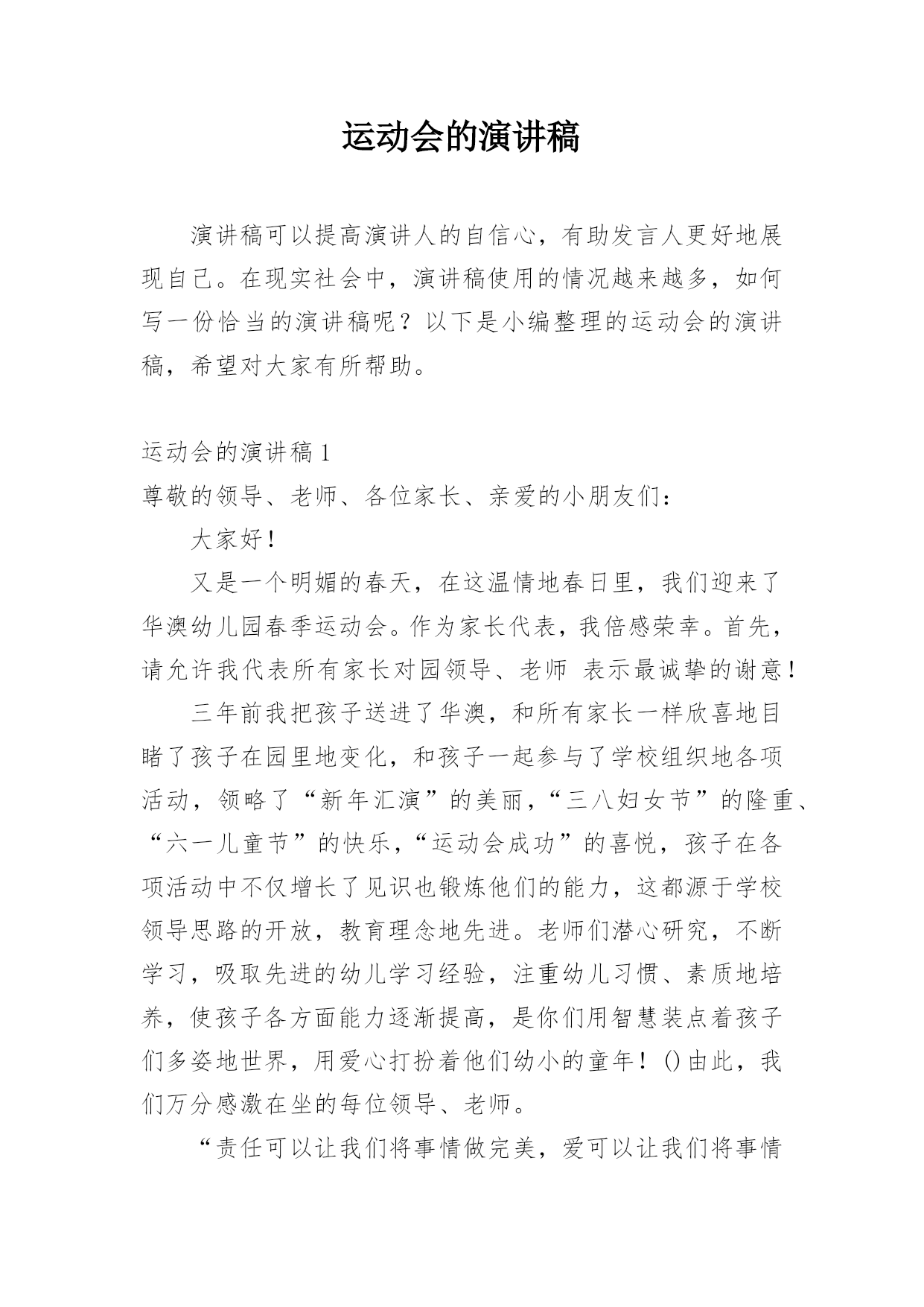 运动会的演讲稿演讲稿可以提高演讲人的自信心,有助发言人更好地展现自己。在现实社会中,演讲稿使用的情况越来越多,如何写一份恰当的演讲稿呢?以下是小编整理的运动会的演讲稿,希望对大家有所帮助。运动会的演讲稿1尊敬的领导、老师、各位家长、亲爱的小朋友们:大家好!又是一个明媚的春天,在这温情地春日里,我们迎来了华澳幼儿园春季运动会。作为家长代表,我倍感荣幸。首先,请允许我代表所有家长对园领导、老师表示最诚挚的谢意!三年前我把孩子送进了华澳,和所有家长一样欣喜地目睹了孩子在园里地变化,和孩子一起参与了学校组织地各项