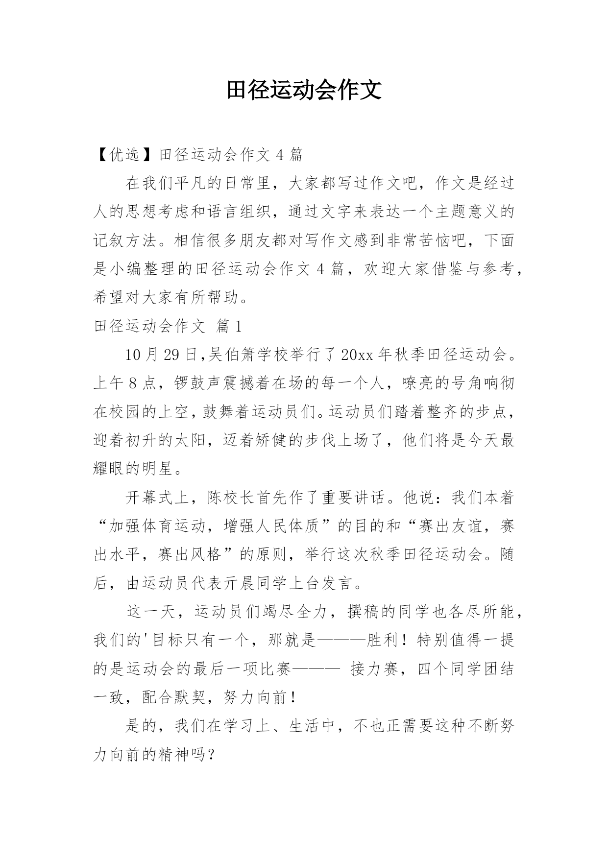 田径运动会作文【优选】田径运动会作文4篇在我们平凡的日常里,大家都写过作文吧,作文是经过人的思想考虑和语言组织,通过文字来表达一个主题意义的记叙方法。相信很多朋友都对写作文感到非常苦恼吧,下面是小编整理的田径运动会作文4篇,欢迎大家借鉴与参考,希望对大家有所帮助。田径运动会作文篇110月29日,吴伯箫学校举行了20xx年秋季田径运动会。上午8点,锣鼓声震撼着在场的每一个人,嘹亮的号角响彻在校园的上空,鼓舞着运动员们。运动员们踏着整齐的步点,迎着初升的太阳,迈着矫健的步伐上场了,他们将是今天最耀眼的明星。开
