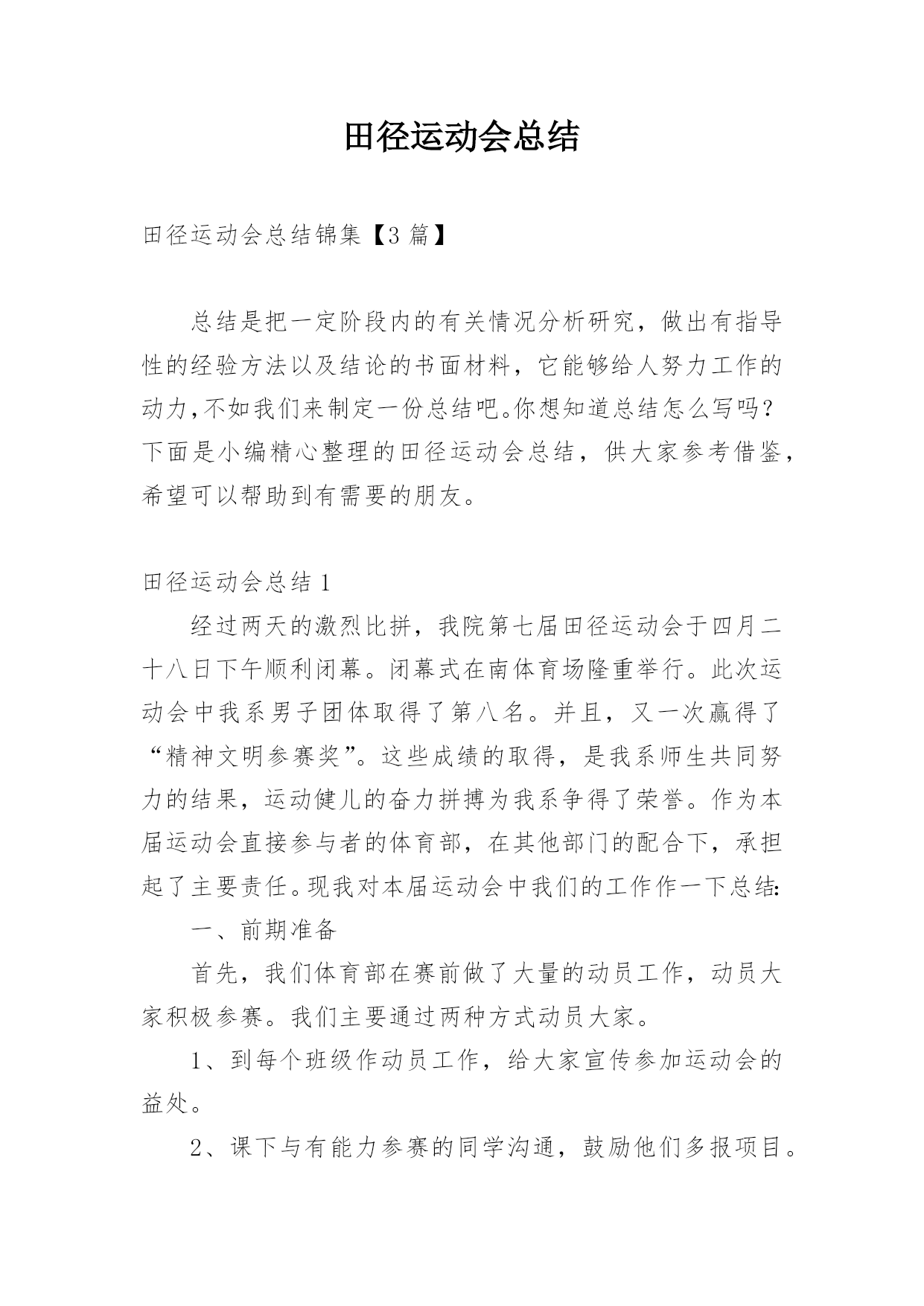 田径运动会总结田径运动会总结锦集【3篇】总结是把一定阶段内的有关情况分析研究,做出有指导性的经验方法以及结论的书面材料,它能够给人努力工作的动力,不如我们来制定一份总结吧。你想知道总结怎么写吗?下面是小编精心整理的田径运动会总结,供大家参考借鉴,希望可以帮助到有需要的朋友。田径运动会总结1经过两天的激烈比拼,我院第七届田径运动会于四月二十八日下午顺利闭幕。闭幕式在南体育场隆重举行。此次运动会中我系男子团体取得了第八名。并且,又一次赢得了“精神文明参赛奖”。这些成绩的取得,是我系师生共同努力的结果,运动健儿