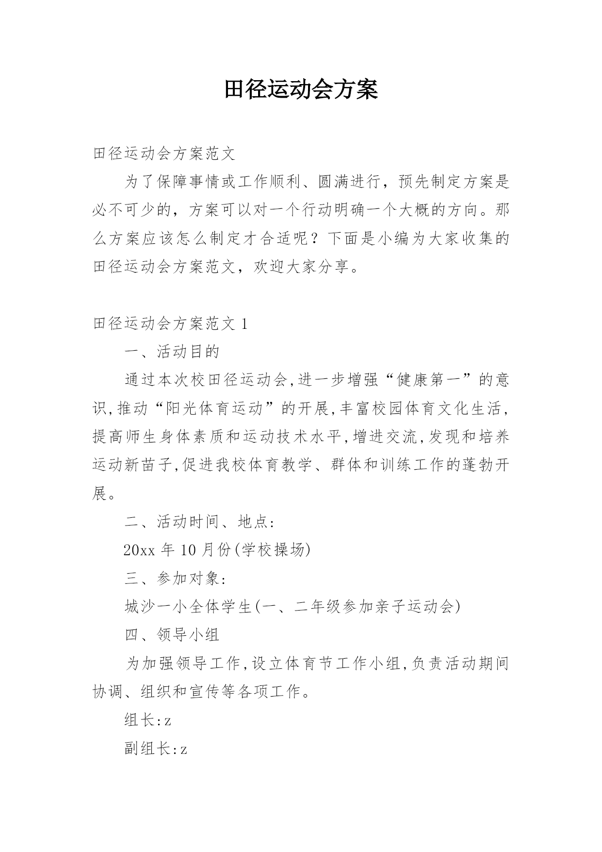 田径运动会方案田径运动会方案范文为了保障事情或工作顺利、圆满进行,预先制定方案是必不可少的,方案可以对一个行动明确一个大概的方向。那么方案应该怎么制定才合适呢?下面是小编为大家收集的田径运动会方案范文,欢迎大家分享。田径运动会方案范文1一、活动目的通过本次校田径运动会,进一步增强“健康第一”的意识,推动“阳光体育运动”的开展,丰富校园体育文化生活,提高师生身体素质和运动技术水平,增进交流,发现和培养运动新苗子,促进我校体育教学、群体和训练工作的蓬勃开展。二、活动时间、地点:20xx年10月份(学校操场)三