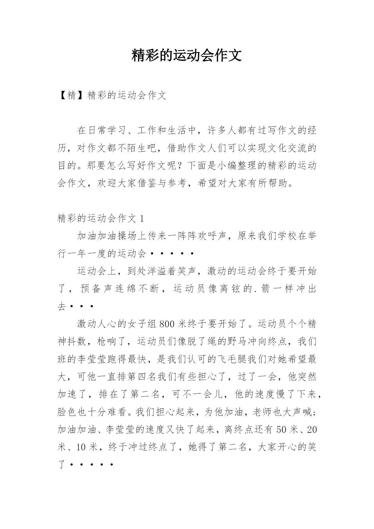 精彩的运动会作文【精】精彩的运动会作文在日常学习、工作和生活中,许多人都有过写作文的经历,对作文都不陌生吧,借助作文人们可以实现文化交流的目的。那要怎么写好作文呢?下面是小编整理的精彩的运动会作文,欢迎大家借鉴与参考,希望对大家有所帮助。精彩的运动会作文1加油加油操场上传来一阵阵欢呼声,原来我们学校在举行一年一度的运动会·····运动会上,到处洋溢着笑声,激动的运动会终于要开始了,预备声连绵不断,运动员像离铉的.箭一样冲出去···激动人心的女子组800米终于要开始了。运动员个个精神抖数,枪响了,运动员们像