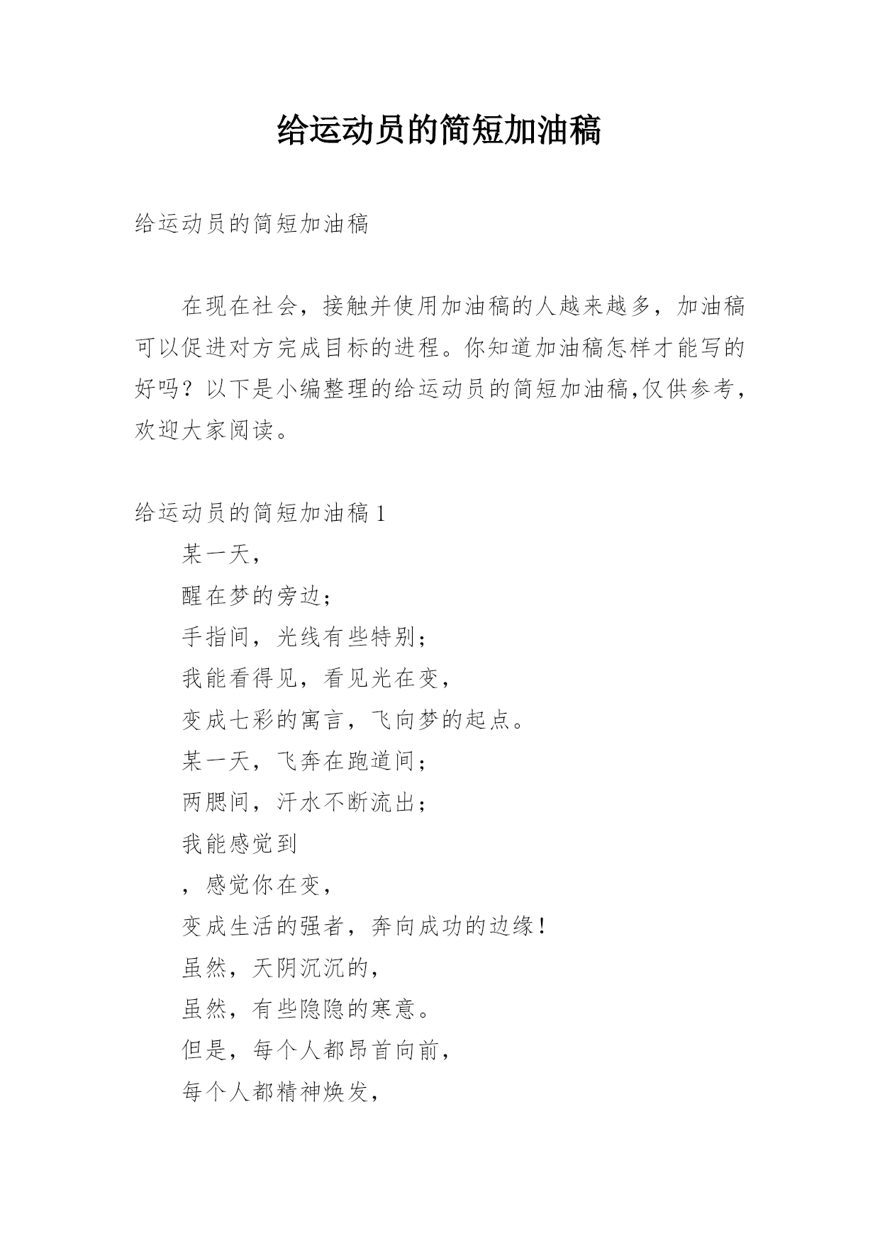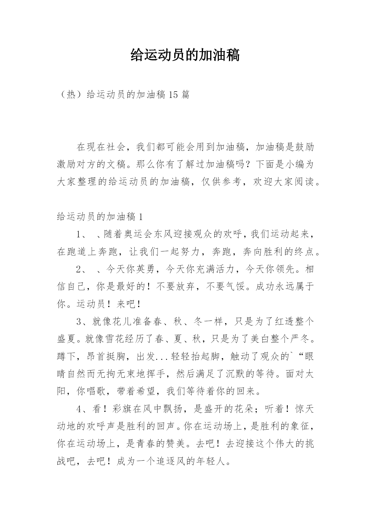给运动员的加油稿(热)给运动员的加油稿15篇在现在社会,我们都可能会用到加油稿,加油稿是鼓励激励对方的文稿。那么你有了解过加油稿吗?下面是小编为大家整理的给运动员的加油稿,仅供参考,欢迎大家阅读。给运动员的加油稿11、、随着奥运会东风迎接观众的欢呼,我们运动起来,在跑道上奔跑,让我们一起努力,奔跑,奔向胜利的终点。2、、今天你英勇,今天你充满活力,今天你领先。相信自己,你是最好的!不要放弃,不要气馁。成功永远属于你。运动员!来吧!3、就像花儿准备春、秋、冬一样,只是为了红透整个盛夏。就像雪花经历了春、夏、