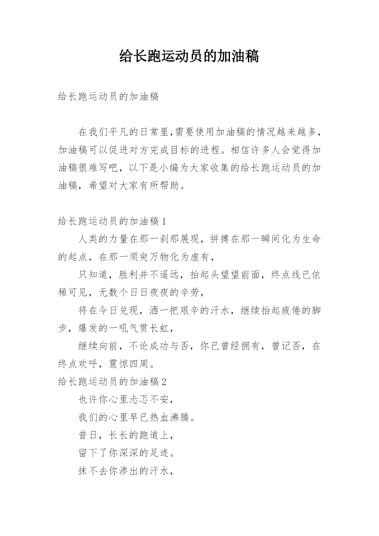 给长跑运动员的加油稿给长跑运动员的加油稿在我们平凡的日常里,需要使用加油稿的情况越来越多,加油稿可以促进对方完成目标的进程。相信许多人会觉得加油稿很难写吧,以下是小编为大家收集的给长跑运动员的加油稿,希望对大家有所帮助。给长跑运动员的加油稿1人类的力量在那一刹那展现,拼搏在那一瞬间化为生命的起点,在那一须臾万物化为虚有,只知道,胜利并不遥远,抬起头望望前面,终点线已依稀可见,无数个日日夜夜的辛劳,将在今日兑现,洒一把艰辛的汗水,继续抬起疲倦的脚步,爆发的一吼气贯长虹,继续向前,不论成功与否,你已曾经拥有,
