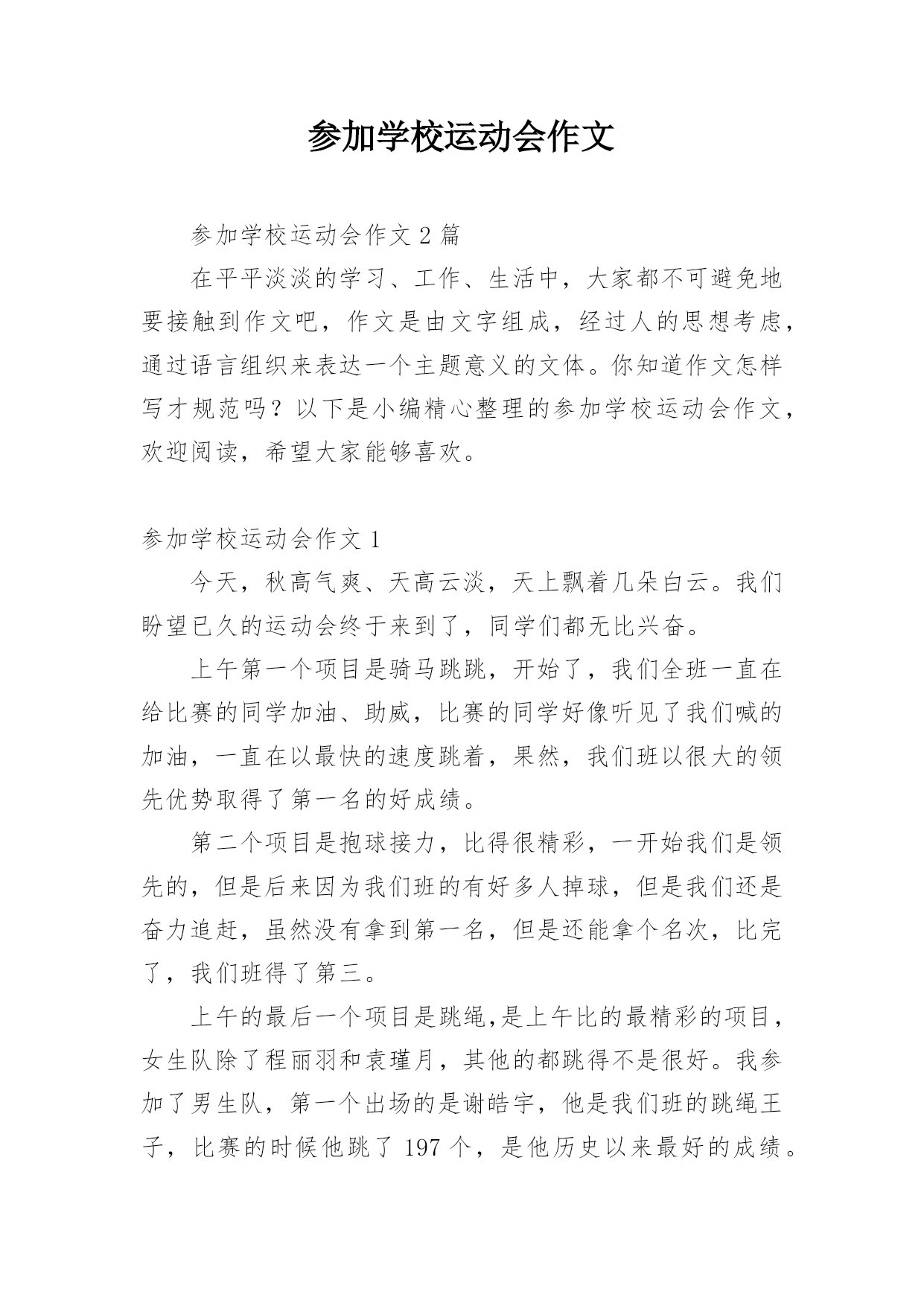 参加学校运动会作文参加学校运动会作文2篇在平平淡淡的学习、工作、生活中,大家都不可避免地要接触到作文吧,作文是由文字组成,经过人的思想考虑,通过语言组织来表达一个主题意义的文体。你知道作文怎样写才规范吗?以下是小编精心整理的参加学校运动会作文,欢迎阅读,希望大家能够喜欢。参加学校运动会作文1今天,秋高气爽、天高云淡,天上飘着几朵白云。我们盼望已久的运动会终于来到了,同学们都无比兴奋。上午第一个项目是骑马跳跳,开始了,我们全班一直在给比赛的同学加油、助威,比赛的同学好像听见了我们喊的加油,一直在以最快的速度
