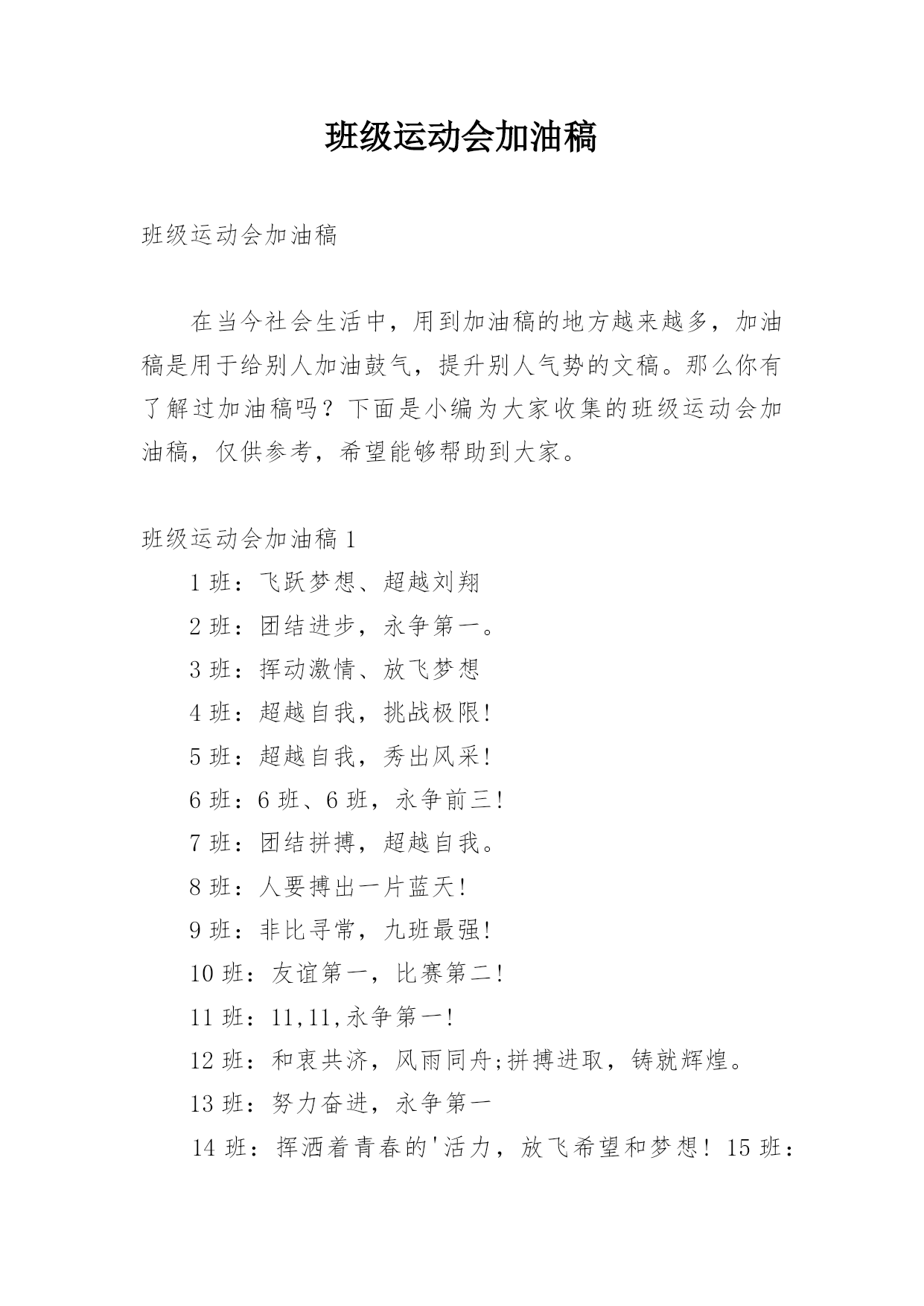 班级运动会加油稿班级运动会加油稿在当今社会生活中,用到加油稿的地方越来越多,加油稿是用于给别人加油鼓气,提升别人气势的文稿。那么你有了解过加油稿吗?下面是小编为大家收集的班级运动会加油稿,仅供参考,希望能够帮助到大家。班级运动会加油稿11班:飞跃梦想、超越刘翔2班:团结进步,永争第一。3班:挥动激情、放飞梦想4班:超越自我,挑战极限!5班:超越自我,秀出风采!6班:6班、6班,永争前三!7班:团结拼搏,超越自我。8班:人要搏出一片蓝天!9班:非比寻常,九班最强!10班:友谊第一,比赛第二!11班:11,1