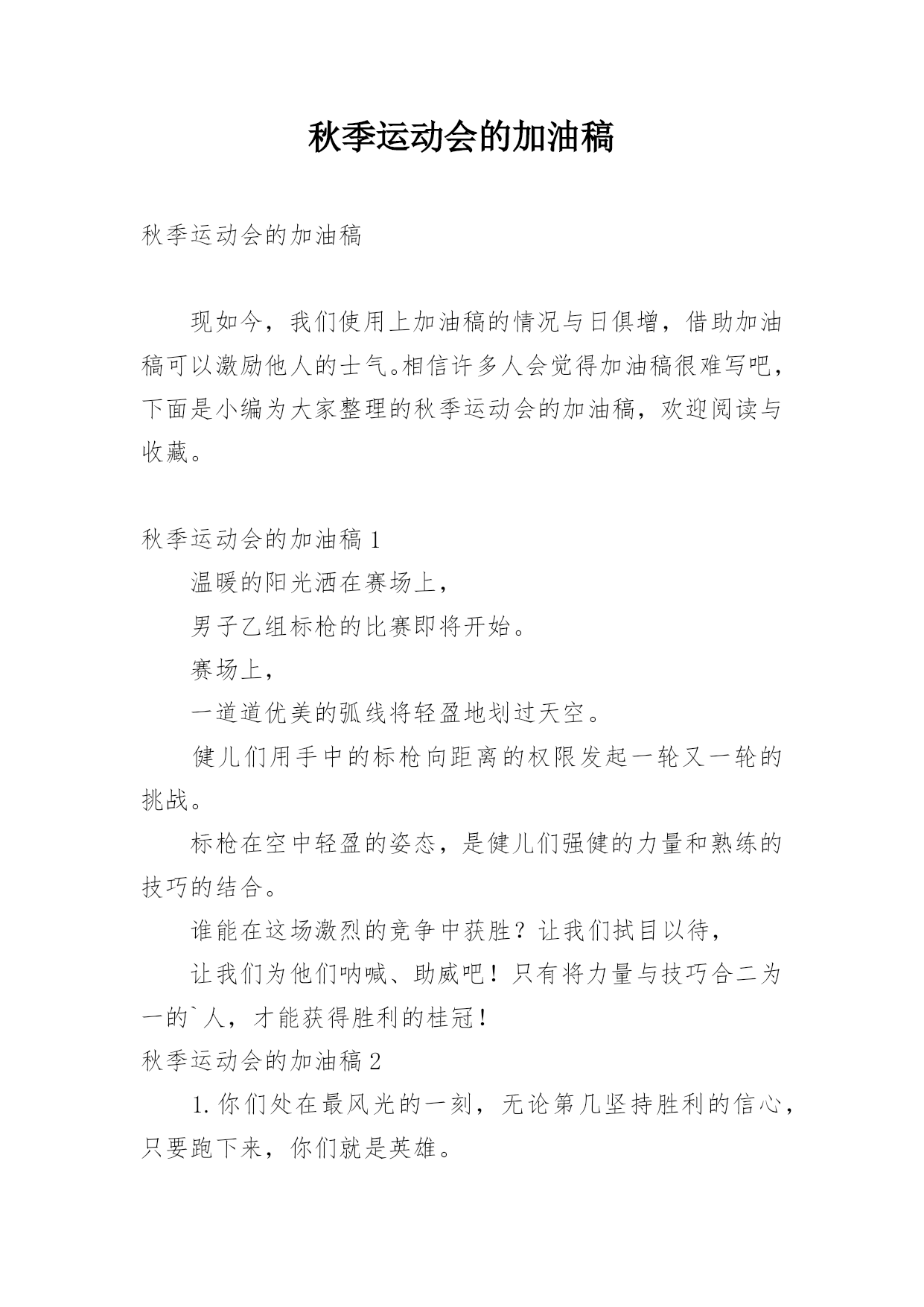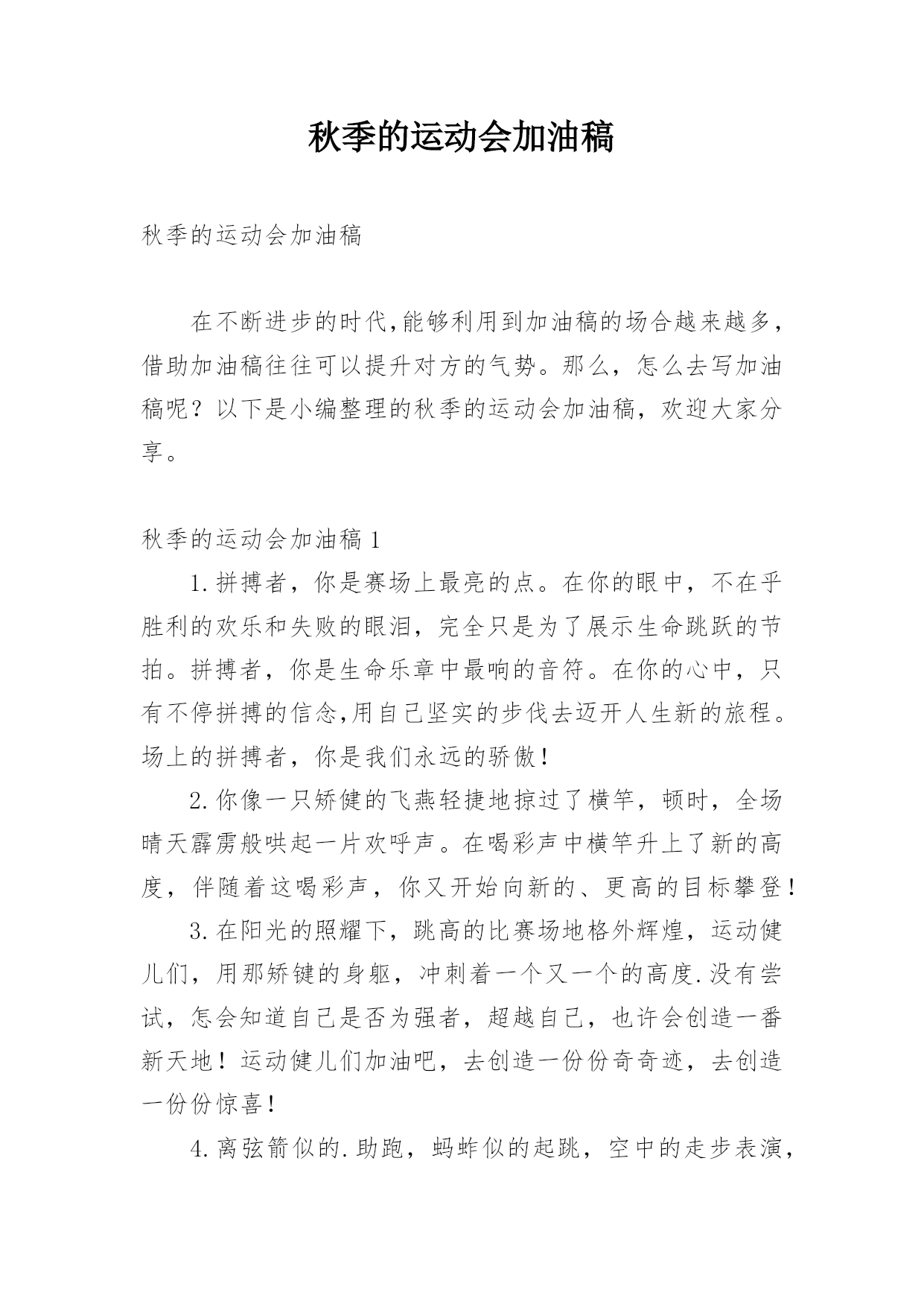 秋季的运动会加油稿秋季的运动会加油稿在不断进步的时代,能够利用到加油稿的场合越来越多,借助加油稿往往可以提升对方的气势。那么,怎么去写加油稿呢?以下是小编整理的秋季的运动会加油稿,欢迎大家分享。秋季的运动会加油稿11.拼搏者,你是赛场上最亮的点。在你的眼中,不在乎胜利的欢乐和失败的眼泪,完全只是为了展示生命跳跃的节拍。拼搏者,你是生命乐章中最响的音符。在你的心中,只有不停拼搏的信念,用自己坚实的步伐去迈开人生新的旅程。场上的拼搏者,你是我们永远的骄傲!2.你像一只矫健的飞燕轻捷地掠过了横竿,顿时,全场晴天