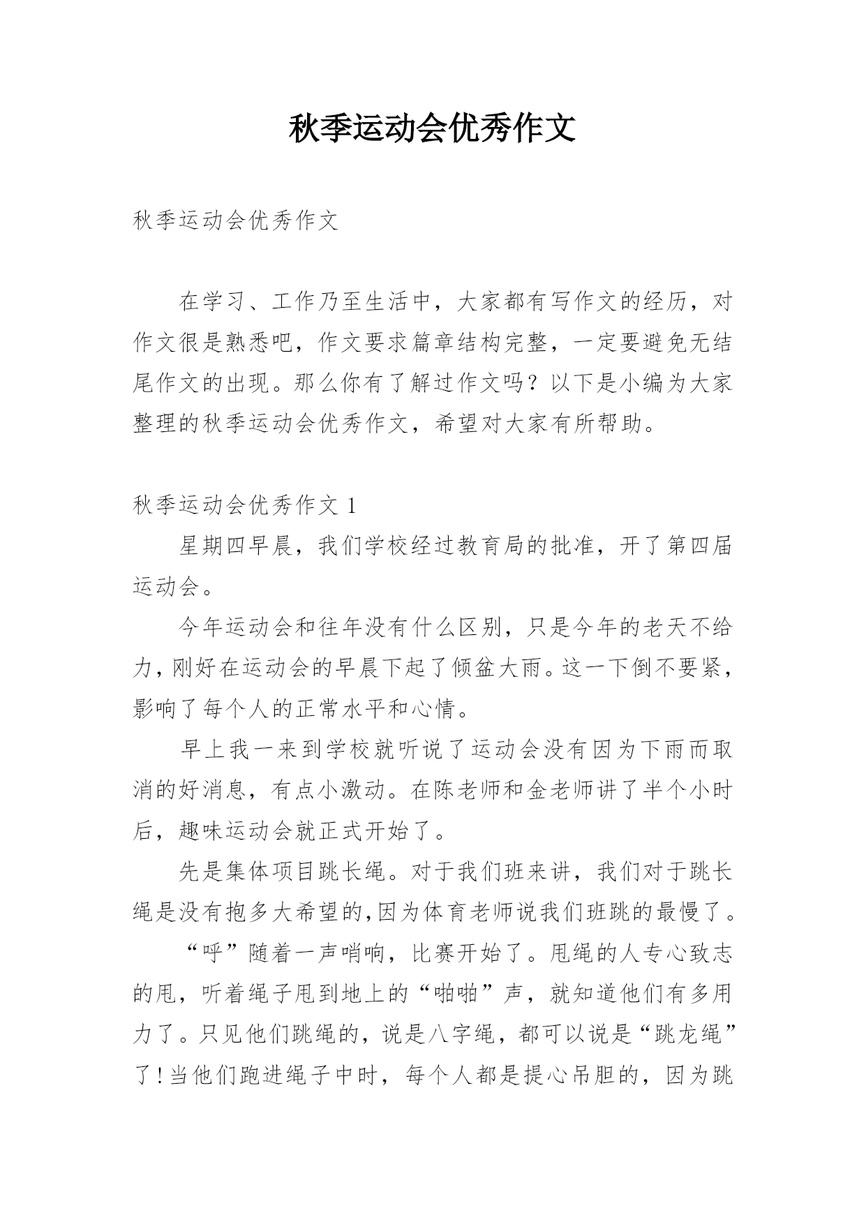 秋季运动会优秀作文秋季运动会优秀作文在学习、工作乃至生活中,大家都有写作文的经历,对作文很是熟悉吧,作文要求篇章结构完整,一定要避免无结尾作文的出现。那么你有了解过作文吗?以下是小编为大家整理的秋季运动会优秀作文,希望对大家有所帮助。秋季运动会优秀作文1星期四早晨,我们学校经过教育局的批准,开了第四届运动会。今年运动会和往年没有什么区别,只是今年的老天不给力,刚好在运动会的早晨下起了倾盆大雨。这一下倒不要紧,影响了每个人的正常水平和心情。早上我一来到学校就听说了运动会没有因为下雨而取消的好消息,有点小激动