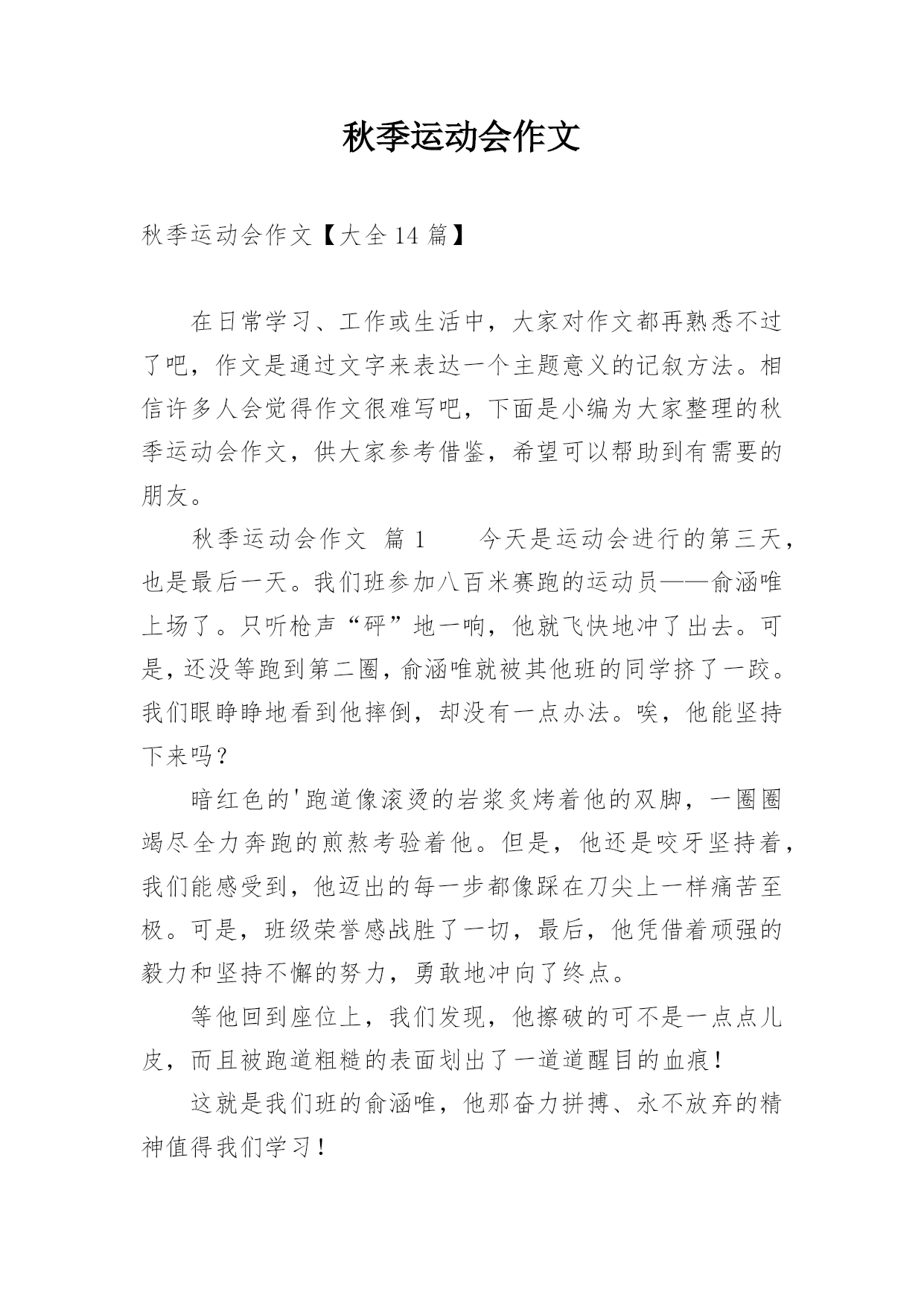 秋季运动会作文秋季运动会作文【大全14篇】在日常学习、工作或生活中,大家对作文都再熟悉不过了吧,作文是通过文字来表达一个主题意义的记叙方法。相信许多人会觉得作文很难写吧,下面是小编为大家整理的秋季运动会作文,供大家参考借鉴,希望可以帮助到有需要的朋友。秋季运动会作文篇1今天是运动会进行的第三天,也是最后一天。我们班参加八百米赛跑的运动员——俞涵唯上场了。只听枪声“砰”地一响,他就飞快地冲了出去。可是,还没等跑到第二圈,俞涵唯就被其他班的同学挤了一跤。我们眼睁睁地看到他摔倒,却没有一点办法。唉,他能坚持下来