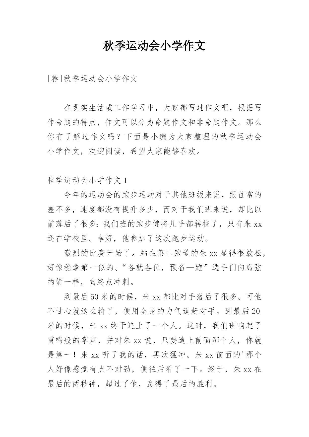 秋季运动会小学作文[荐]秋季运动会小学作文在现实生活或工作学习中,大家都写过作文吧,根据写作命题的特点,作文可以分为命题作文和非命题作文。那么你有了解过作文吗?下面是小编为大家整理的秋季运动会小学作文,欢迎阅读,希望大家能够喜欢。秋季运动会小学作文1今年的运动会的跑步运动对于其他班级来说,跟往常的差不多,速度都没有提升多少,而对于我们班来说,却比以前落后了很多:我们班的跑步健将几乎都转校了,只有朱xx还在学校里。幸好,他参加了这次跑步运动。激烈的比赛开始了。站在第二跑道的朱xx显得很放松,好像稳拿第一似的
