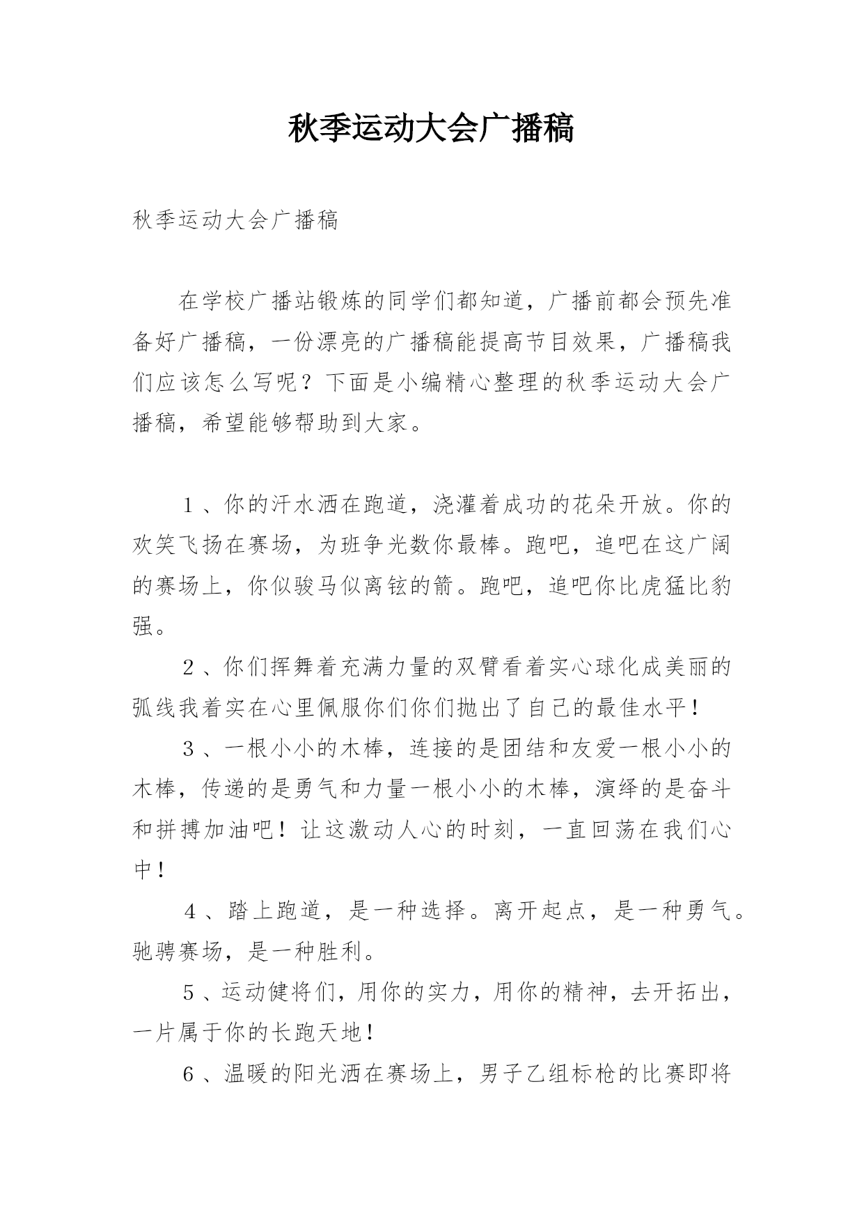 秋季运动大会广播稿秋季运动大会广播稿在学校广播站锻炼的同学们都知道,广播前都会预先准备好广播稿,一份漂亮的广播稿能提高节目效果,广播稿我们应该怎么写呢?下面是小编精心整理的秋季运动大会广播稿,希望能够帮助到大家。1、你的汗水洒在跑道,浇灌着成功的花朵开放。你的欢笑飞扬在赛场,为班争光数你最棒。跑吧,追吧在这广阔的赛场上,你似骏马似离铉的箭。跑吧,追吧你比虎猛比豹强。2、你们挥舞着充满力量的双臂看着实心球化成美丽的弧线我着实在心里佩服你们你们抛出了自己的最佳水平!3、一根小小的木棒,连接的是团结和友爱一根小