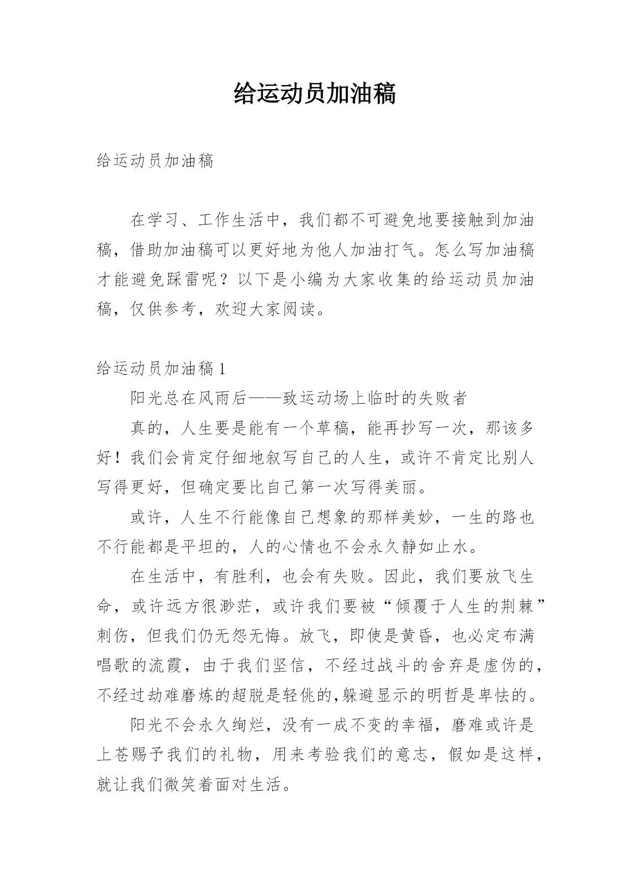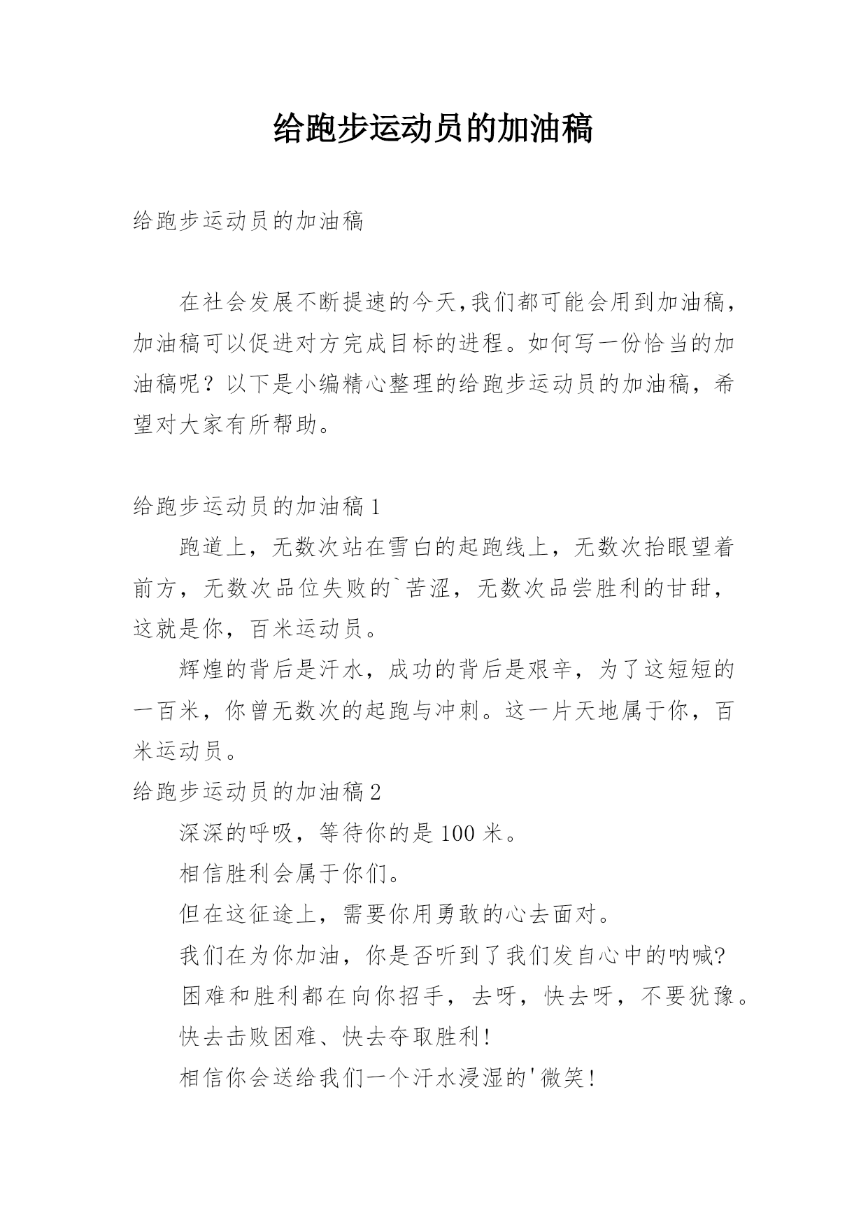 给跑步运动员的加油稿给跑步运动员的加油稿在社会发展不断提速的今天,我们都可能会用到加油稿,加油稿可以促进对方完成目标的进程。如何写一份恰当的加油稿呢?以下是小编精心整理的给跑步运动员的加油稿,希望对大家有所帮助。给跑步运动员的加油稿1跑道上,无数次站在雪白的起跑线上,无数次抬眼望着前方,无数次品位失败的`苦涩,无数次品尝胜利的甘甜,这就是你,百米运动员。辉煌的背后是汗水,成功的背后是艰辛,为了这短短的一百米,你曾无数次的起跑与冲刺。这一片天地属于你,百米运动员。给跑步运动员的加油稿2深深的呼吸,等待你的是