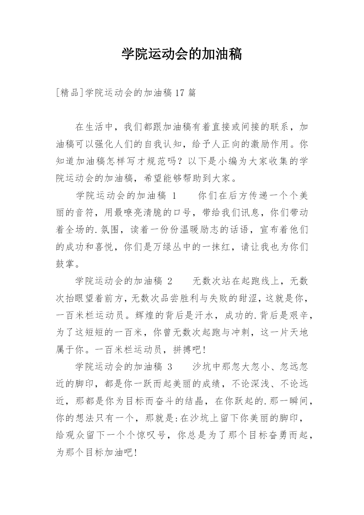 学院运动会的加油稿[精品]学院运动会的加油稿17篇在生活中,我们都跟加油稿有着直接或间接的联系,加油稿可以强化人们的自我认知,给予人正向的激励作用。你知道加油稿怎样写才规范吗?以下是小编为大家收集的学院运动会的加油稿,希望能够帮助到大家。学院运动会的加油稿1你们在后方传递一个个美丽的音符,用最嘹亮清脆的口号,带给我们讯息,你们带动着全场的.氛围,读着一份份温暖励志的话语,宣布着他们的成功和喜悦,你们是万绿丛中的一抹红,请让我也为你们鼓掌。学院运动会的加油稿2无数次站在起跑线上,无数次抬眼望着前方,无数次品