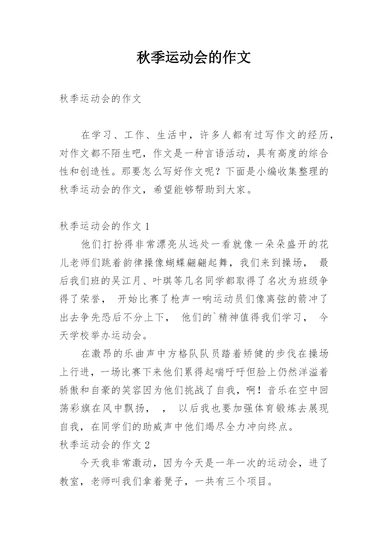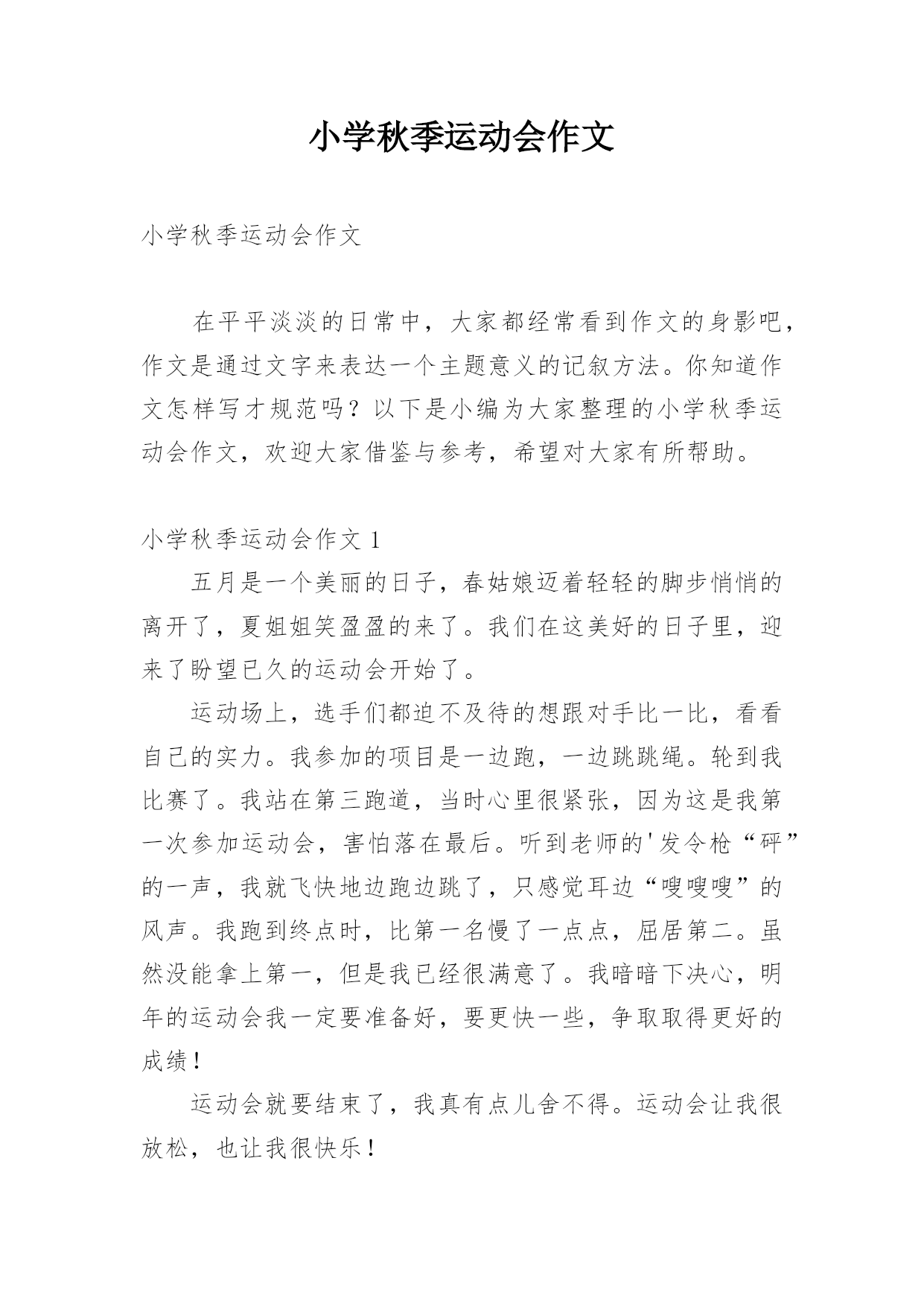 小学秋季运动会作文小学秋季运动会作文在平平淡淡的日常中,大家都经常看到作文的身影吧,作文是通过文字来表达一个主题意义的记叙方法。你知道作文怎样写才规范吗?以下是小编为大家整理的小学秋季运动会作文,欢迎大家借鉴与参考,希望对大家有所帮助。小学秋季运动会作文1五月是一个美丽的日子,春姑娘迈着轻轻的脚步悄悄的离开了,夏姐姐笑盈盈的来了。我们在这美好的日子里,迎来了盼望已久的运动会开始了。运动场上,选手们都迫不及待的想跟对手比一比,看看自己的实力。我参加的项目是一边跑,一边跳跳绳。轮到我比赛了。我站在第三跑道,当