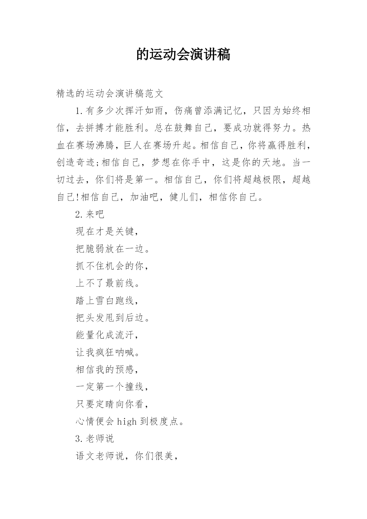 的运动会演讲稿精选的运动会演讲稿范文1.有多少次挥汗如雨,伤痛曾添满记忆,只因为始终相信,去拼搏才能胜利。总在鼓舞自己,要成功就得努力。热血在赛场沸腾,巨人在赛场升起。相信自己,你将赢得胜利,创造奇迹;相信自己,梦想在你手中,这是你的天地。当一切过去,你们将是第一。相信自己,你们将超越极限,超越自己!相信自己,加油吧,健儿们,相信你自己。2.来吧现在才是关键,把脆弱放在一边。抓不住机会的你,上不了最前线。踏上雪白跑线,把头发甩到后边。能量化成流汗,让我疯狂呐喊。相信我的预感,一定第一个撞线,只要定睛向你看