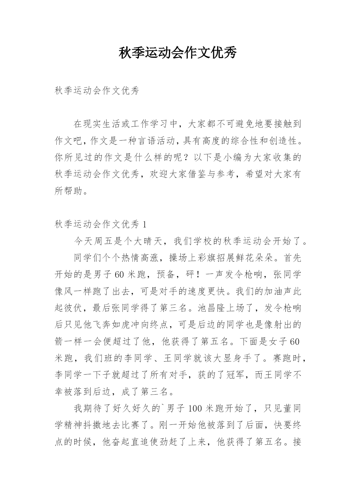 秋季运动会作文优秀秋季运动会作文优秀在现实生活或工作学习中,大家都不可避免地要接触到作文吧,作文是一种言语活动,具有高度的综合性和创造性。你所见过的作文是什么样的呢?以下是小编为大家收集的秋季运动会作文优秀,欢迎大家借鉴与参考,希望对大家有所帮助。秋季运动会作文优秀1今天周五是个大晴天,我们学校的秋季运动会开始了。同学们个个热情高涨,操场上彩旗招展鲜花朵朵。首先开始的是男子60米跑,预备,砰!一声发令枪响,张同学像风一样跑了出去,可是对手的速度更快。我们的加油声此起彼伏,最后张同学得了第三名。池昌隆上场了