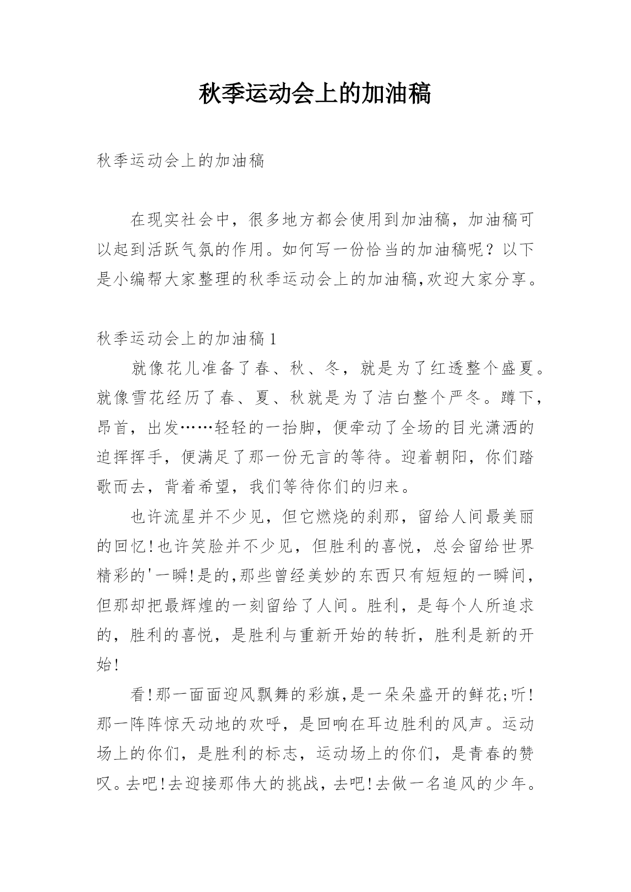 秋季运动会上的加油稿秋季运动会上的加油稿在现实社会中,很多地方都会使用到加油稿,加油稿可以起到活跃气氛的作用。如何写一份恰当的加油稿呢?以下是小编帮大家整理的秋季运动会上的加油稿,欢迎大家分享。秋季运动会上的加油稿1就像花儿准备了春、秋、冬,就是为了红透整个盛夏。就像雪花经历了春、夏、秋就是为了洁白整个严冬。蹲下,昂首,出发……轻轻的一抬脚,便牵动了全场的目光潇洒的迫挥挥手,便满足了那一份无言的等待。迎着朝阳,你们踏歌而去,背着希望,我们等待你们的归来。也许流星并不少见,但它燃烧的刹那,留给人间最美丽的回