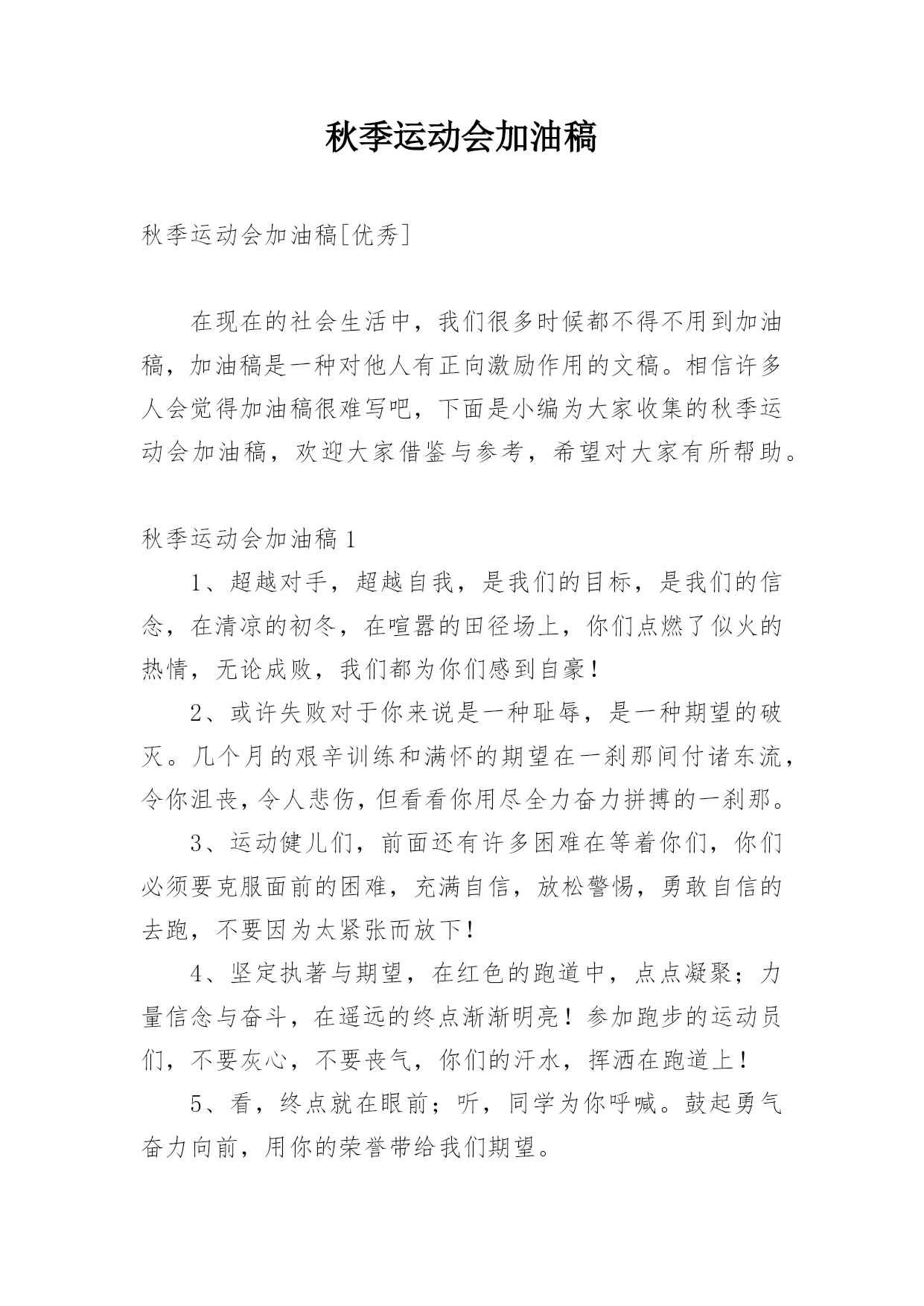 秋季运动会加油稿秋季运动会加油稿[优秀]在现在的社会生活中,我们很多时候都不得不用到加油稿,加油稿是一种对他人有正向激励作用的文稿。相信许多人会觉得加油稿很难写吧,下面是小编为大家收集的秋季运动会加油稿,欢迎大家借鉴与参考,希望对大家有所帮助。秋季运动会加油稿11、超越对手,超越自我,是我们的目标,是我们的信念,在清凉的初冬,在喧嚣的田径场上,你们点燃了似火的热情,无论成败,我们都为你们感到自豪!2、或许失败对于你来说是一种耻辱,是一种期望的破灭。几个月的艰辛训练和满怀的期望在一刹那间付诸东流,令你沮丧,