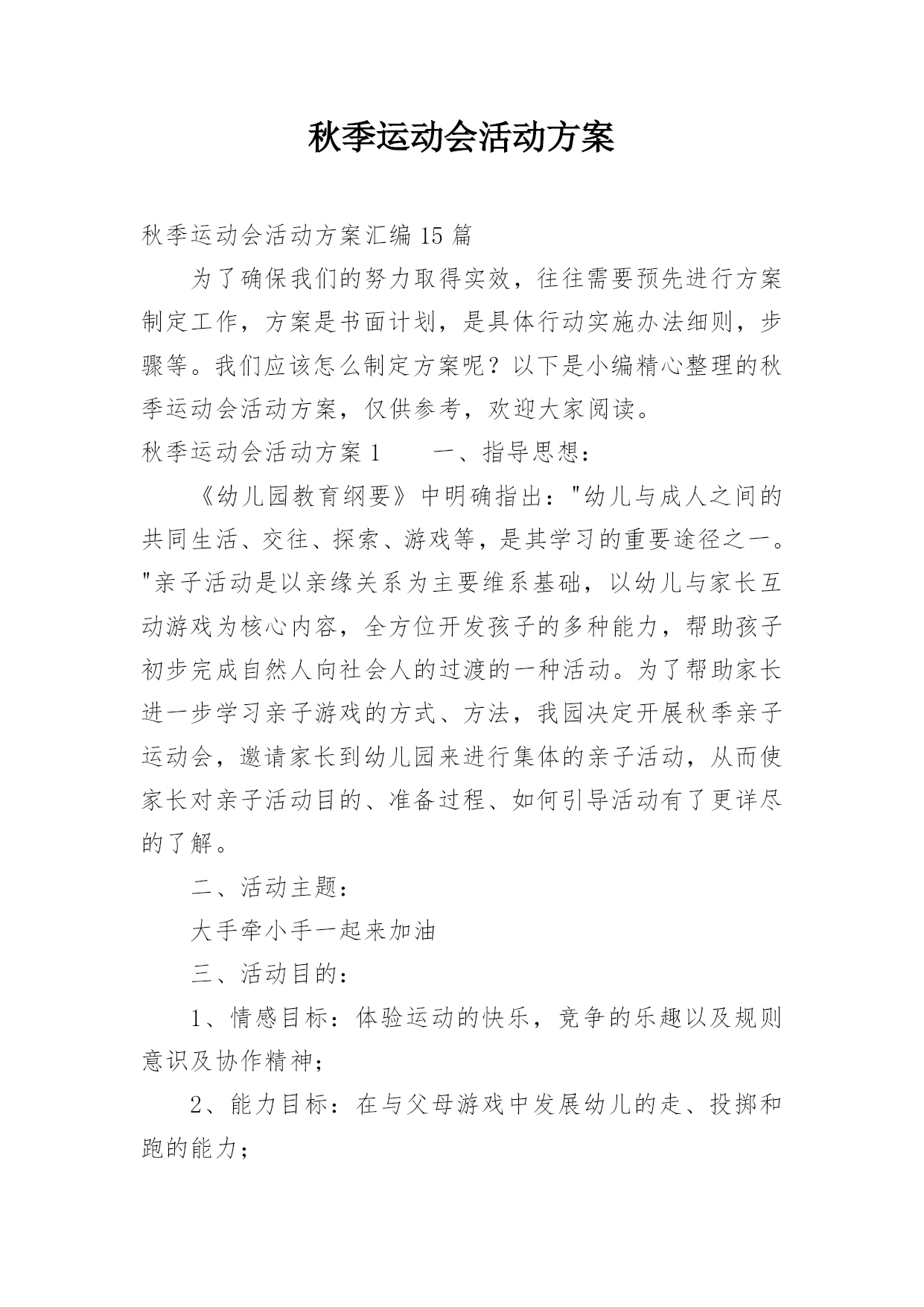 秋季运动会活动方案秋季运动会活动方案汇编15篇为了确保我们的努力取得实效,往往需要预先进行方案制定工作,方案是书面计划,是具体行动实施办法细则,步骤等。我们应该怎么制定方案呢?以下是小编精心整理的秋季运动会活动方案,仅供参考,欢迎大家阅读。秋季运动会活动方案1一、指导思想:《幼儿园教育纲要》中明确指出:"幼儿与成人之间的共同生活、交往、探索、游戏等,是其学习的重要途径之一。"亲子活动是以亲缘关系为主要维系基础,以幼儿与家长互动游戏为核心内容,全方位开发孩子的多种能力,帮助孩子初步完成自然人向社会人的过渡的