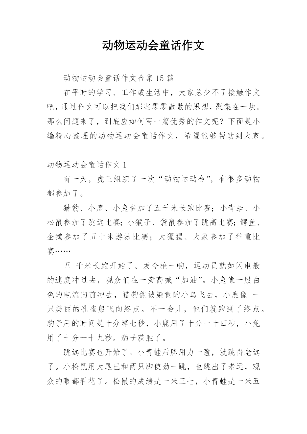 动物运动会童话作文动物运动会童话作文合集15篇在平时的学习、工作或生活中,大家总少不了接触作文吧,通过作文可以把我们那些零零散散的思想,聚集在一块。那么问题来了,到底应如何写一篇优秀的作文呢?下面是小编精心整理的动物运动会童话作文,希望能够帮助到大家。动物运动会童话作文1有一天,虎王组织了一次“动物运动会”,有很多动物都参加了。猎豹、小鹿、小兔参加了五千米长跑比赛;小青蛙、小松鼠参加了跳远比赛;小猴子、袋鼠参加了跳高比赛;鳄鱼、企鹅参加了五十米游泳比赛;大猩猩、大象参加了举重比赛……五千米长跑开始了。发令