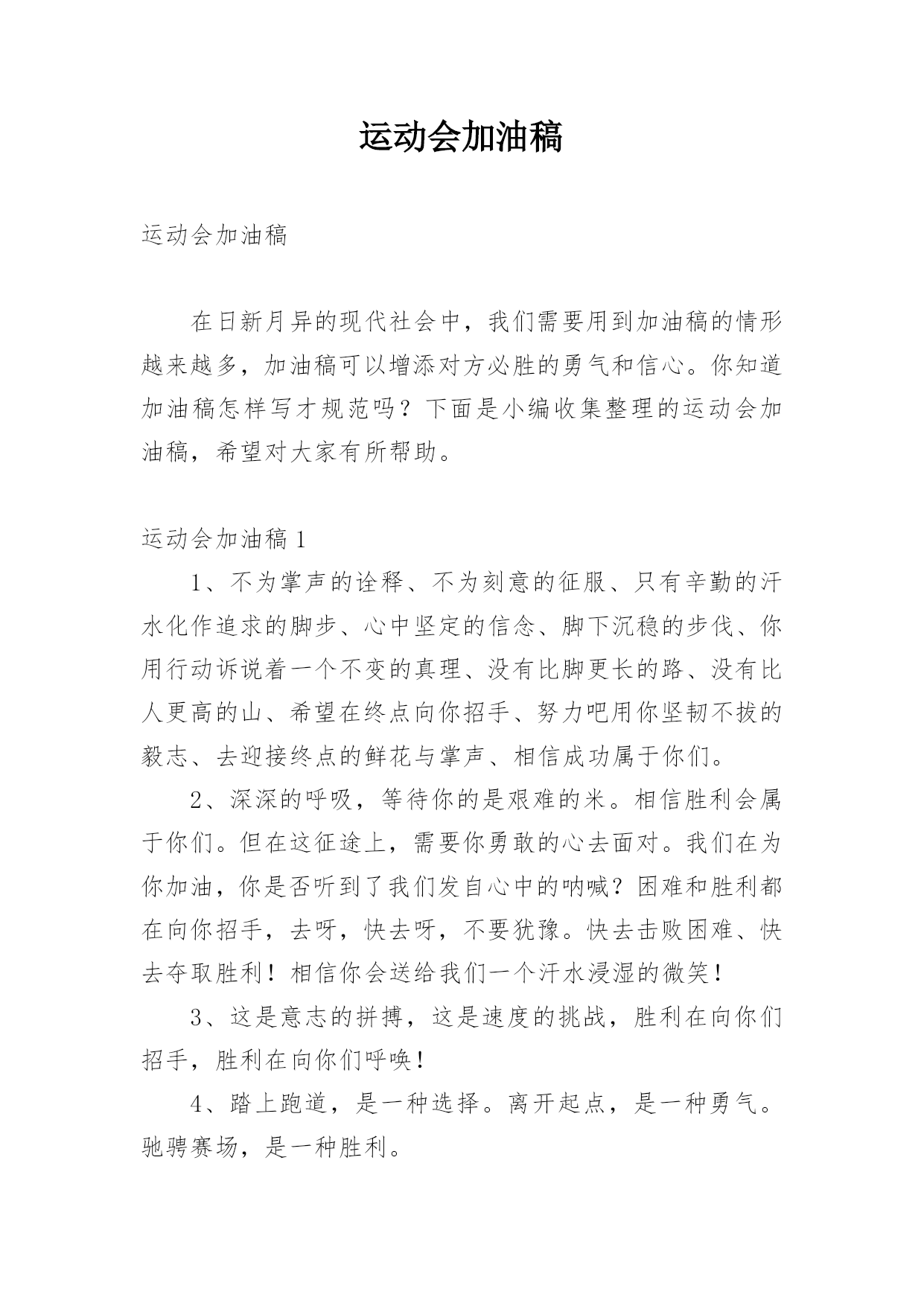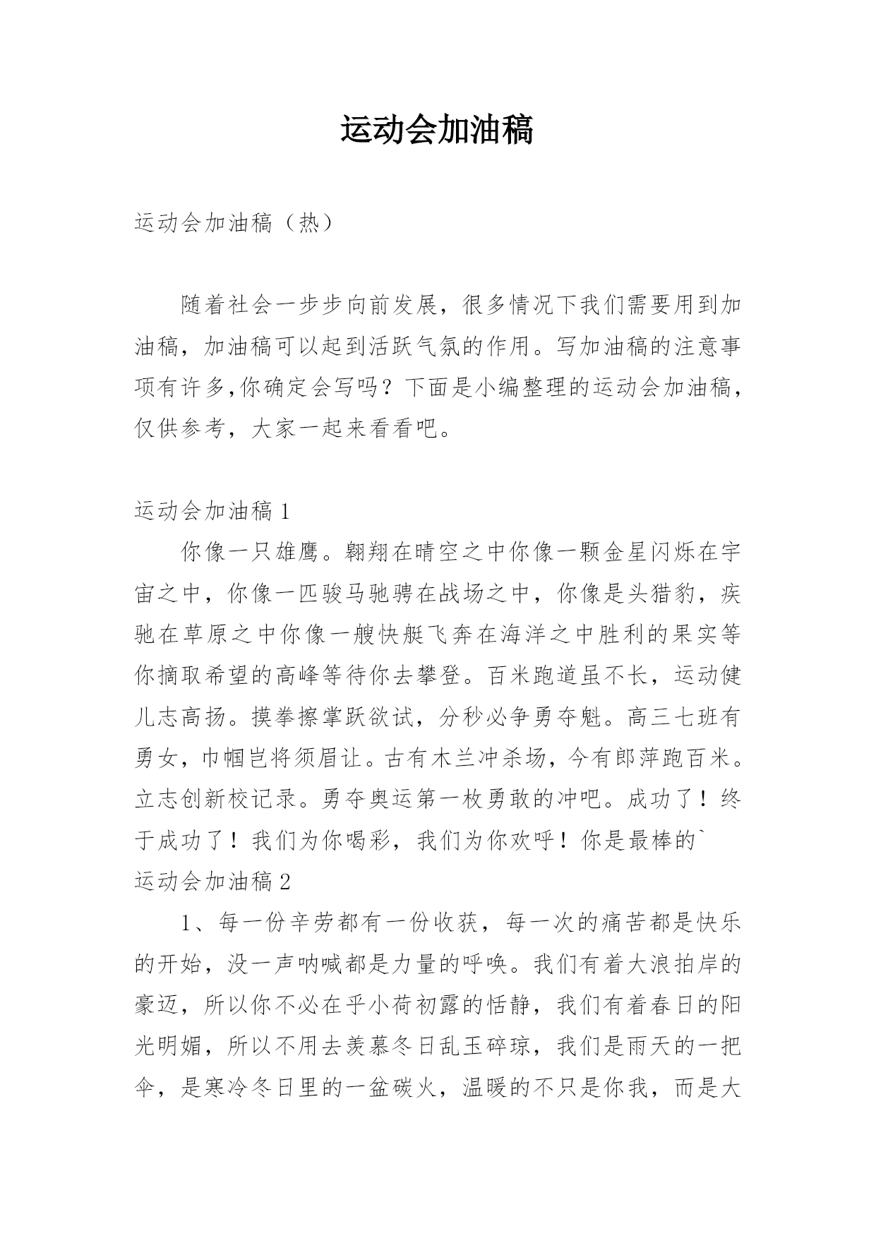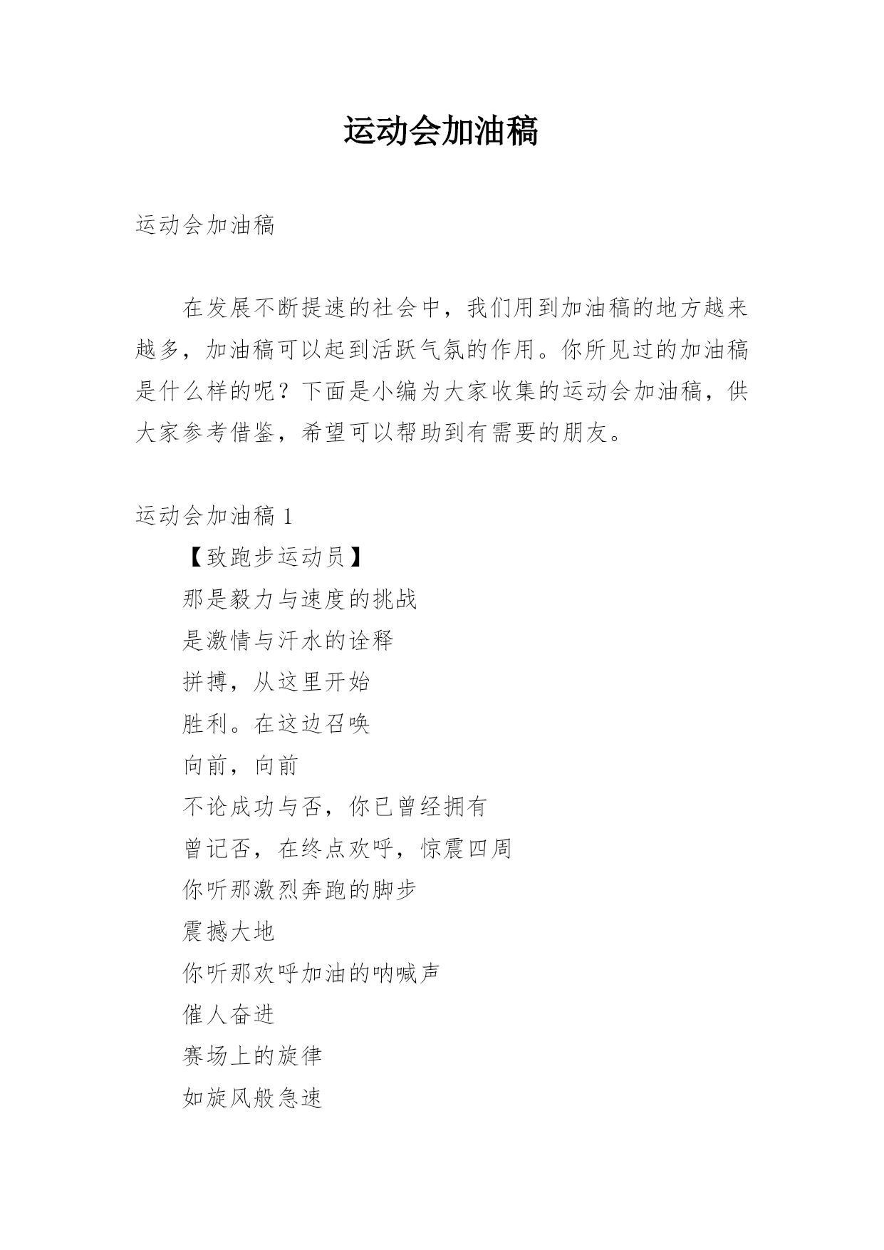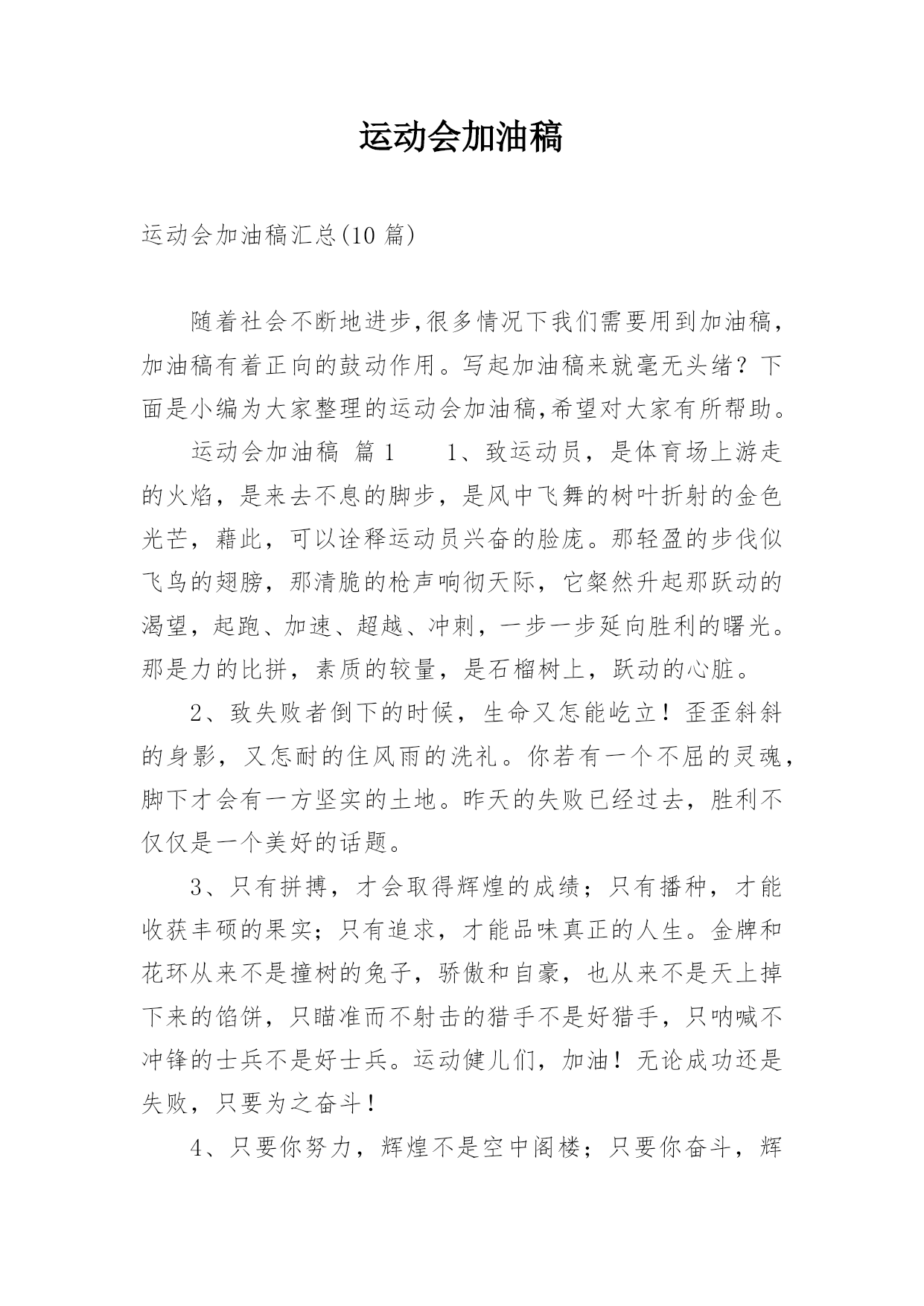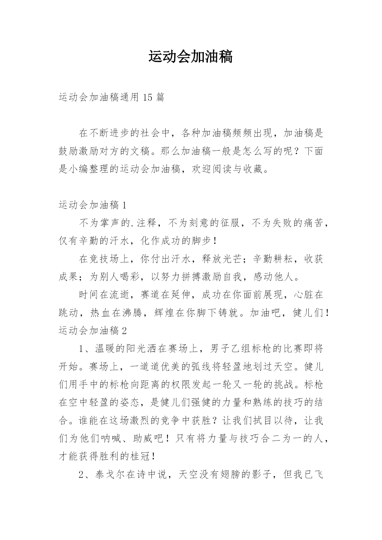 运动会加油稿运动会加油稿通用15篇在不断进步的社会中,各种加油稿频频出现,加油稿是鼓励激励对方的文稿。那么加油稿一般是怎么写的呢?下面是小编整理的运动会加油稿,欢迎阅读与收藏。运动会加油稿1不为掌声的.注释,不为刻意的征服,不为失败的痛苦,仅有辛勤的汗水,化作成功的脚步!在竞技场上,你付出汗水,释放光芒;辛勤耕耘,收获成果;为别人喝彩,以努力拼搏激励自我,感动他人。时间在流逝,赛道在延伸,成功在你面前展现,心脏在跳动,热血在沸腾,辉煌在你脚下铸就。加油吧,健儿们!运动会加油稿21、温暖的阳光洒在赛场上,男
